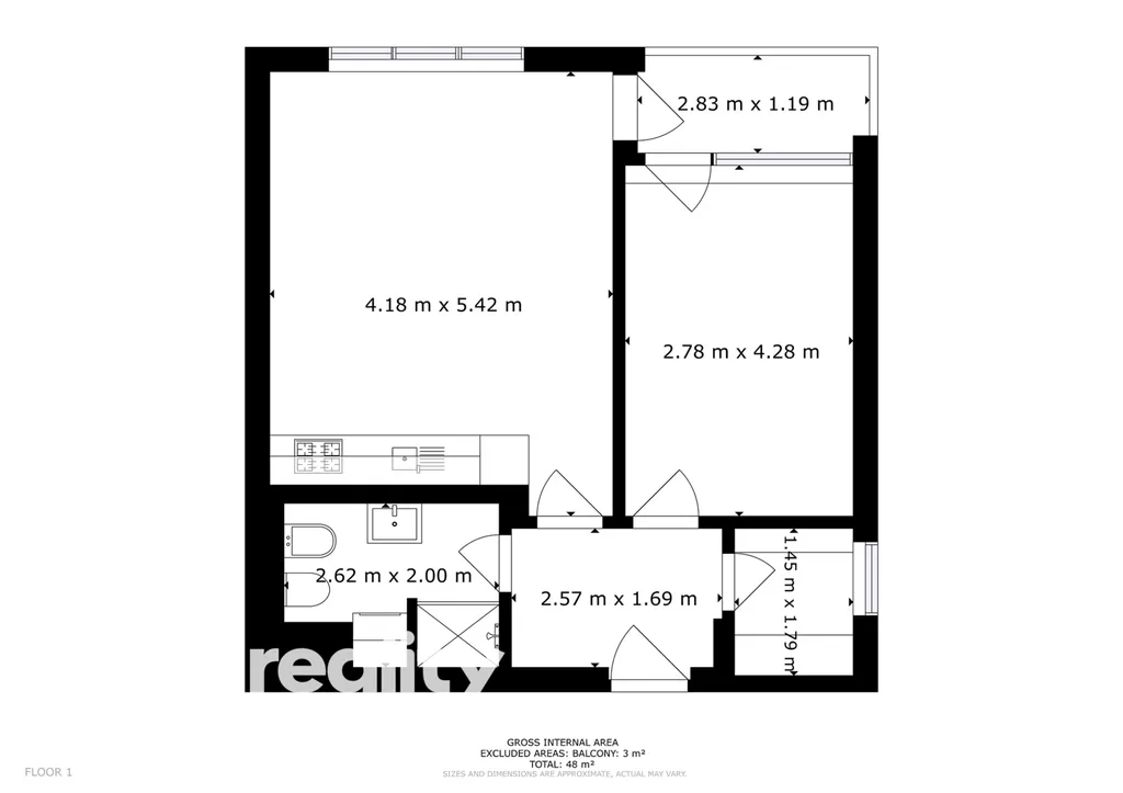 Dispozice: pokoj s kuchyňským koutem: vybavená kuchyňská linka (lednice, mrazák, myčka, sklo-keramická indukční deska, elektrická trouba, mikrovlnná trouba), sedačka s taburetem, konferenční stolek. Ložnice s manželskou postelí, nočními stolky a komodou; koupelna se sprchovým koutem, umyvadlem, toaletou, bidetem a pračkou; šatna s úložnými prostory; předsíň, lodžie. Vybavení: venkovní elektr. žaluzie.