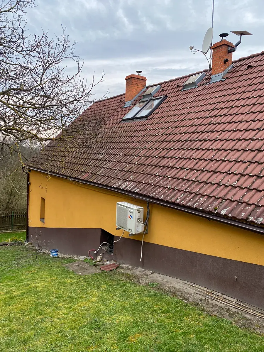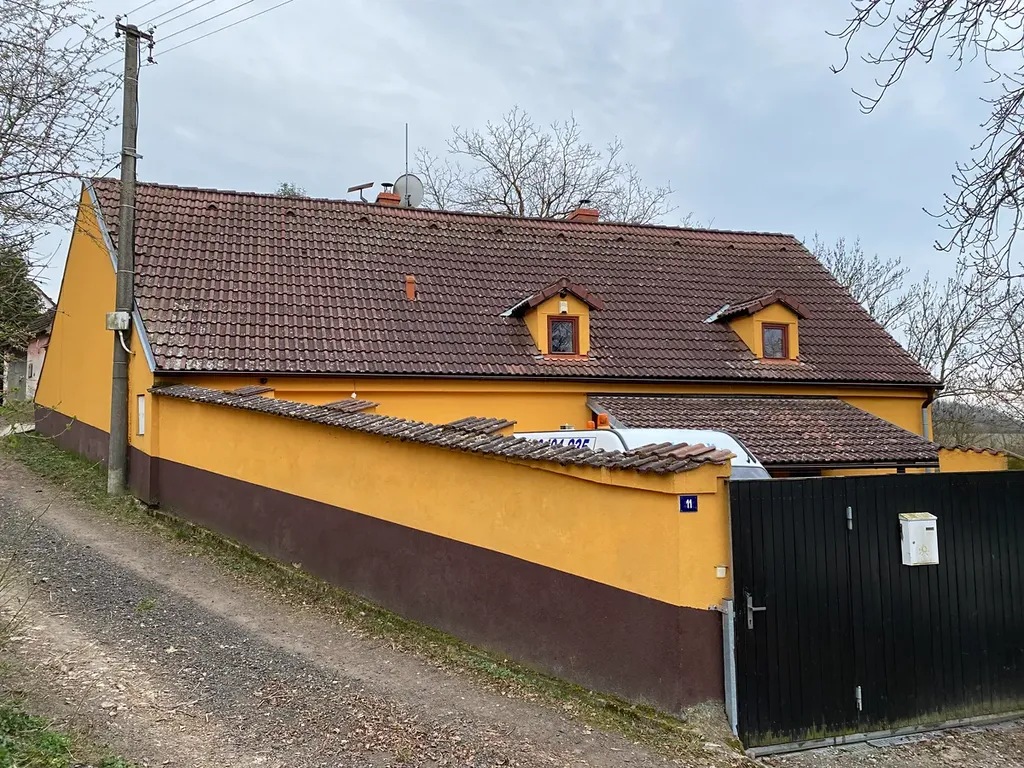 Pozemek oplocený, zatravněný, udržovaný, možnost parkování ve dvoře, automatická otevírací brána. Zahrada rovinatá a částečně svažitá, nerušený výhled do zeleně. Dům napojen na elektřinu, voda z vlastního vrtu a z původní studny ve sklepě, odpad sveden do septiku. Střešní krytina, svody, komíny i fasáda prošly výměnou či opravou.
