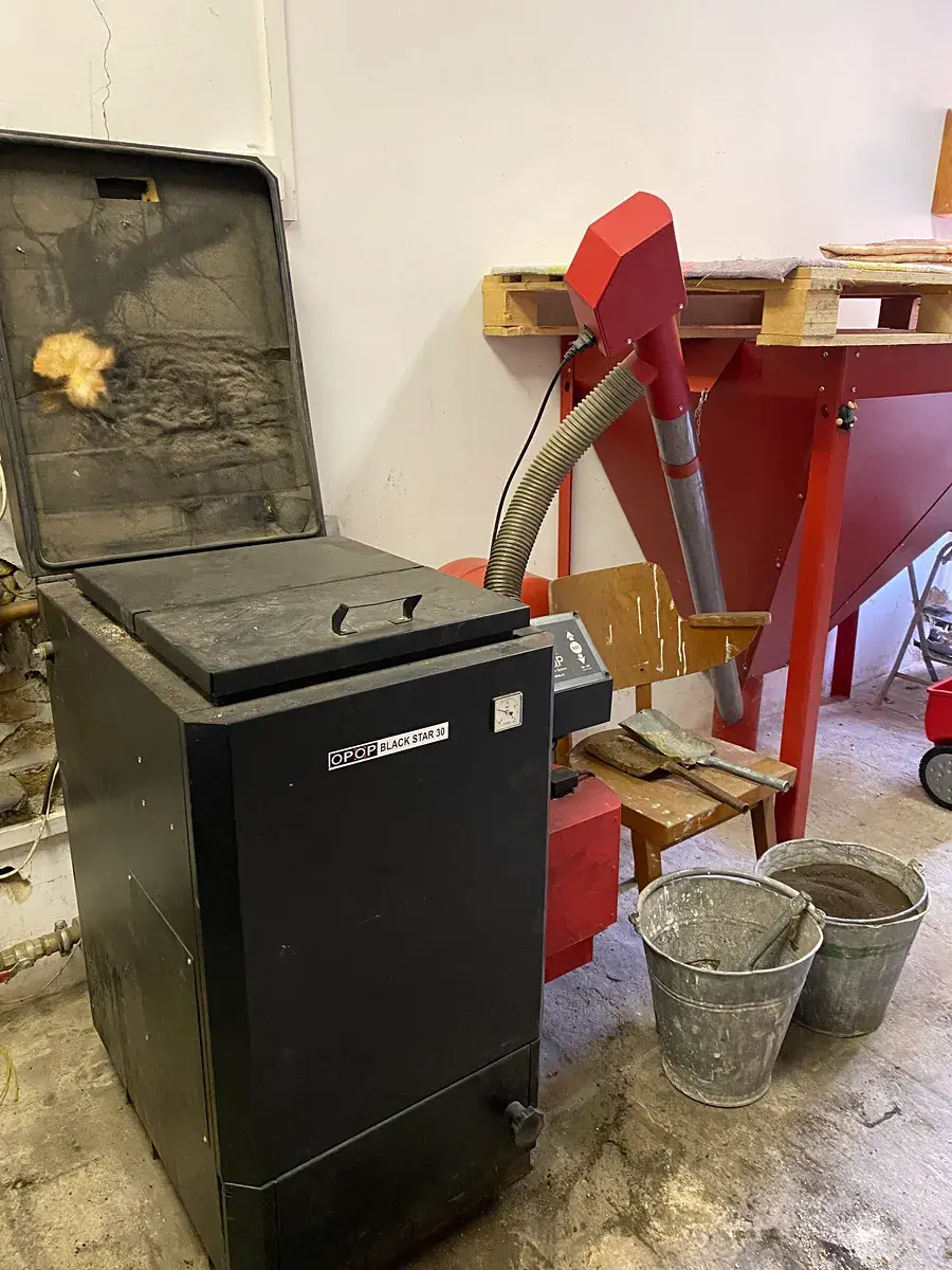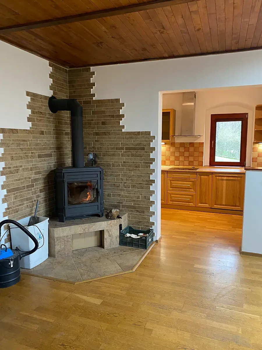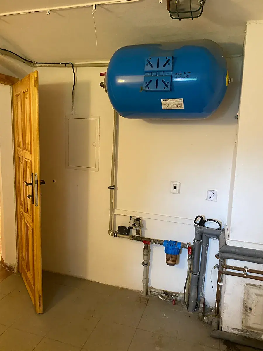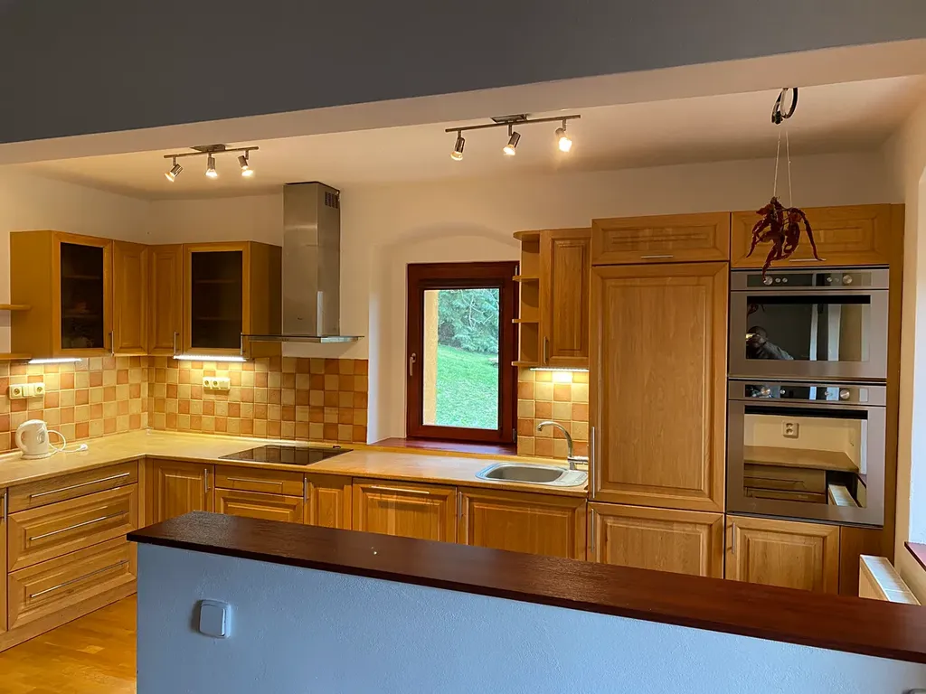 V přízemí domu garáž s kotlem na pelety s automatickým podavačem, rozvod do radiátorů v celém domě. Před domem zastřešená venkovní terasa. Ze vstupní chodby se jde do obývacího pokoje s kuchyňským koutem, plně vybavená kuchyň z masivu, obývací pokoj s krbovými kamny. V přízemí velká koupelna s částečně zapuštěnou vanou, umyvadly a Wc, dále vstup do technické místnosti a do sklepa, kde je systém pro čerpání a rozvod vody.