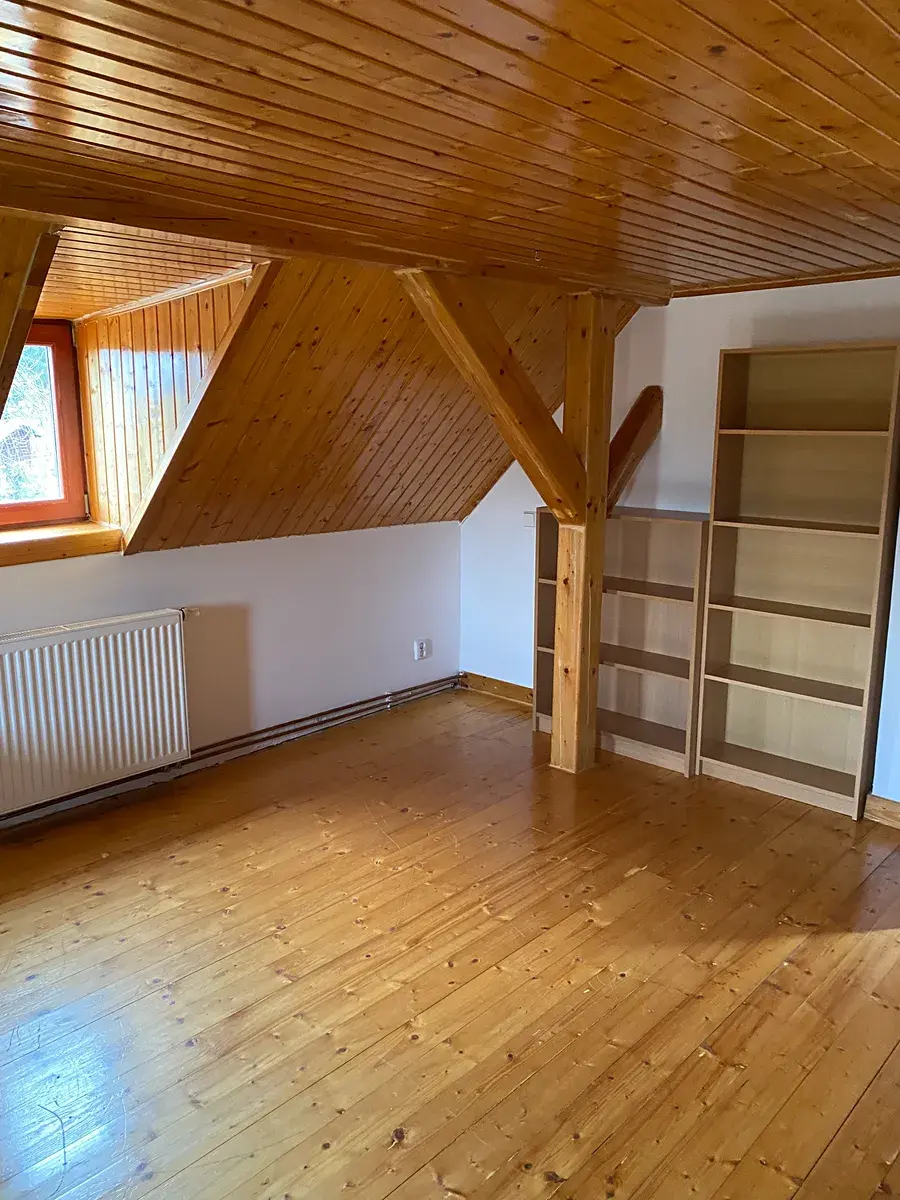 V 1. patře samostatná ložnice, velký dětský pokoj a otevřený prostor pro další využití (ložnice, WC, pracovna, šatna), viditelné trámy, okenní vikýře, dřevěné podlahy, úložné prostory. V patře klimatizační jednotka.