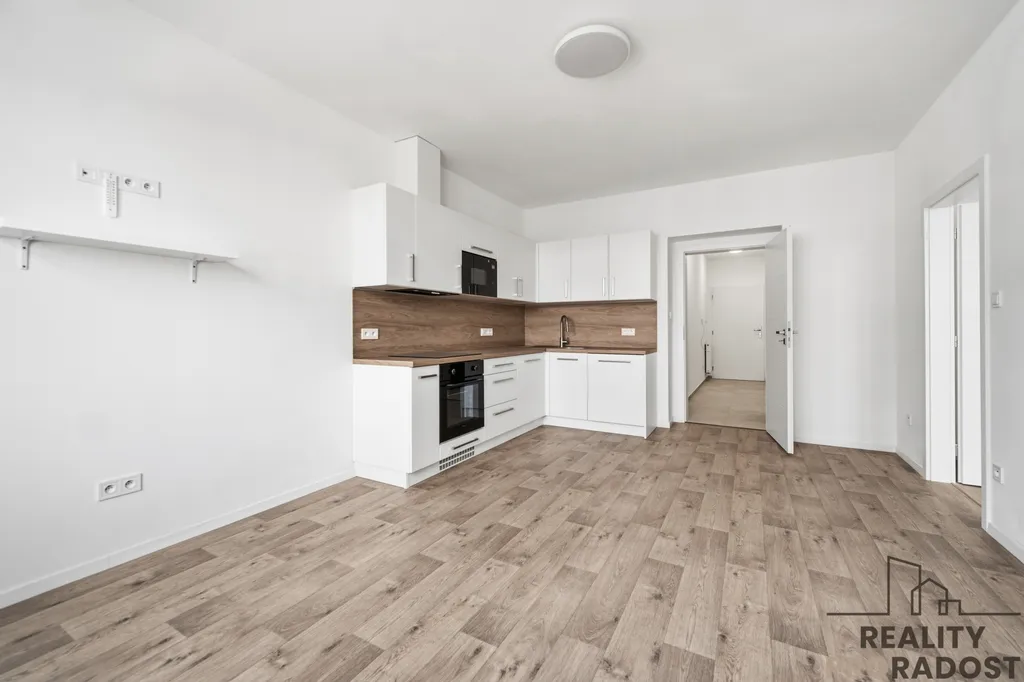 Kuchyňská linka je plně vybavena spotřebiči – indukční varná deska, trouba, mikrovlnná trouba, myčka 60 cm a lednice s mrazákem. Celý byt je proveden v moderním standardu s důrazem na kvalitu materiálů.