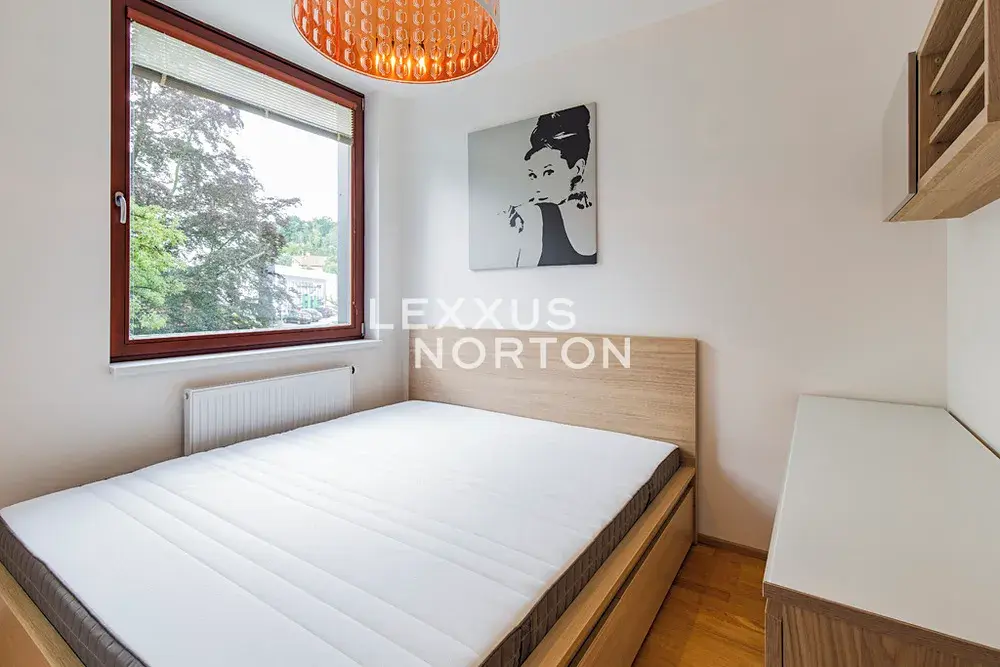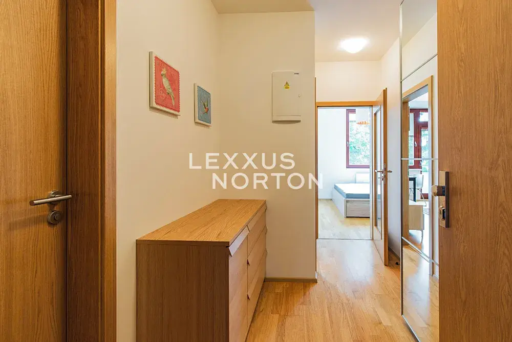 Byt nabízí k užívání vstupní chodbu, obývací pokoj s kuchyňským koutem a vstupem na terasu (6 m2), ložnici a koupelnu. K pronájmu slunného bytu náleží jedno garážové parkovací stání, které je již zahrnuto v ceně nájmu a sklep.