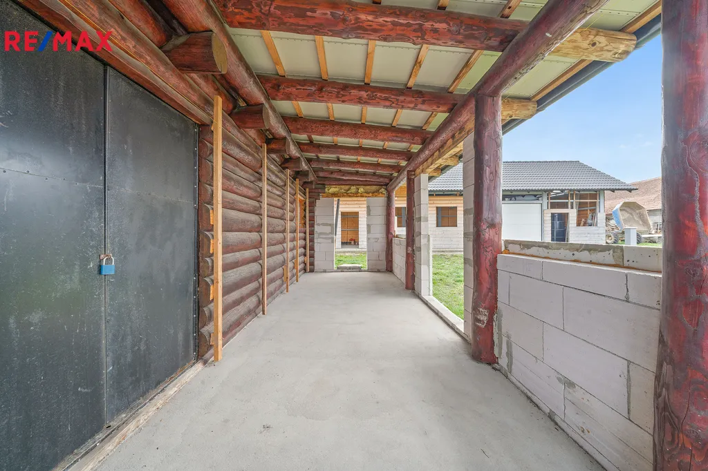 Pozemek je oplocen novým zděným plotem se sloupky, který stačí doplnit o výplň dle vlastního výběru, například dřevěné latě. Velkým benefitem této nemovitosti je prostorná garáž s dílnou a skladem, která je postavena na betonových základových pásech s ocelovou konstrukcí a dřevěným opláštěním. Garáž disponuje velkými elektricky ovládanými vraty a velkými okny, která jsou připravena k osazení. Tento prostor nabízí široké možnosti využití nejen pro parkování, ale také jako truhlářská nebo zámečnická dílna, autoservis, skladové prostory nebo zázemí pro drobné podnikání. Díky velikosti a konstrukci je ideální pro každého, kdo potřebuje kombinovat bydlení s prací nebo svými koníčky.