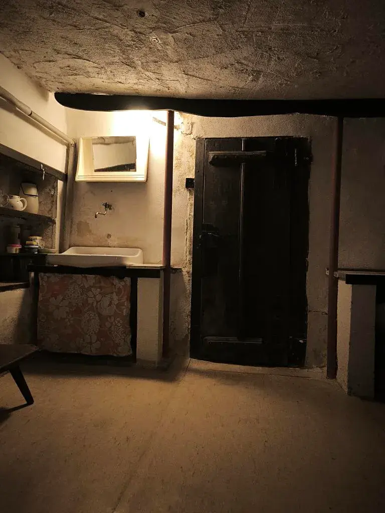 Přízemí tvoří prosklené zádveří černé kuchyně, koupelnového zázemí a další místnosti. Koupelnové zázemí je vybaveno sprchovým zděným koutem, umyvadlem, toaletou a malou saunou.