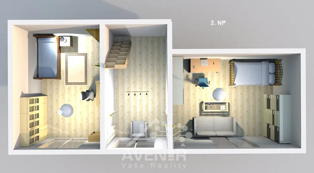 2. NP - celkem 55 m2 - 2 pokoje (19,5 a 21,5 m2), chodba (13,9 m2), vstup do 1. NP a na půdu,
