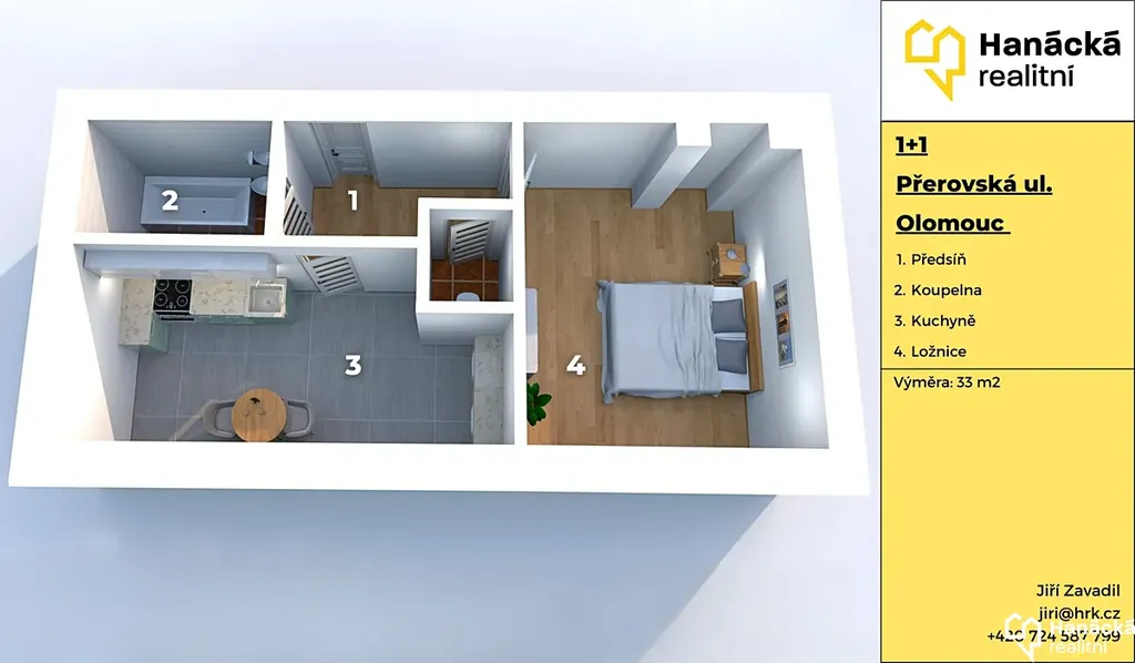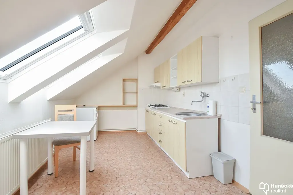 S výhradním zastoupením nabízíme ke koupi cihlový byt o dispozici 1+1 v Olomouci. Jedná se o byt v osobním vlastnictví nacházející se v podkroví čtyřpodlažního cihlového bytového domu na ulici Přerovská. Všechna okna bytu jsou orientovaná severovýchodním směrem do klidu zahrad a zeleně. Byt má podlahovou plochu cca 33,6 m2 a praktické dispoziční uspořádání. Koupelna vybavená vanou a umývadlem, samostatném WC, všechna okna jsou již plastová. Vytápění bytu je řešeno ústředním topením z vlastního kombinovaného plynového kotle zn. Bosch, který slouží i k ohřevu vody. Koupi bytu je možné financovat hypotékou, volné ihned. Vhodné i jako investice k následnému pronájmu. Bližší informace u makléře zakázky.