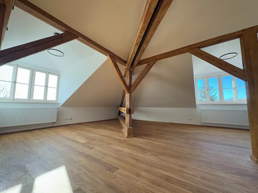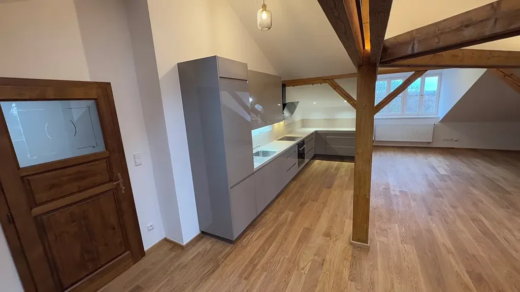Nabízíme k pronájmu exkluzivní podkrovní byt č. 2 o dispozici 3+kk a rozloze 175 m², který se nachází v prestižní novorenesanční Vile Mazanka. Tato historická budova stojí v klidné lokalitě s rozsáhlou privátní zahradou a parkem o velikosti 9.000 m², což zajišťuje maximální míru soukromí a klidu. Byt prošel náročnou rekonstrukcí, při níž byly použity prvotřídní materiály a pečlivě zachovány všechny historické detaily, což mu dodává unikátní atmosféru.