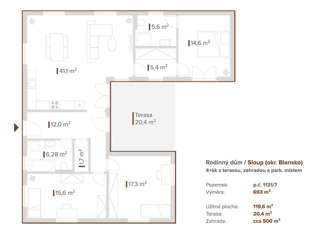 Rodinný dům 4+kk s užitnou plochou 120 m², terasou 20 m², zahradou a parkováním pro 2 vozidla splňuje požadavky dnešních rodin – pohodlí, funkčnost, prostor, bezpečí i nízké provozní náklady.