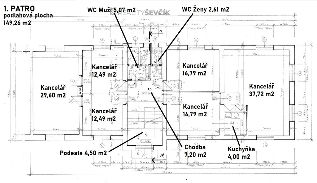 1. patro (149 m²): kancelářské prostory, sociální zázemí včetně kuchyňky