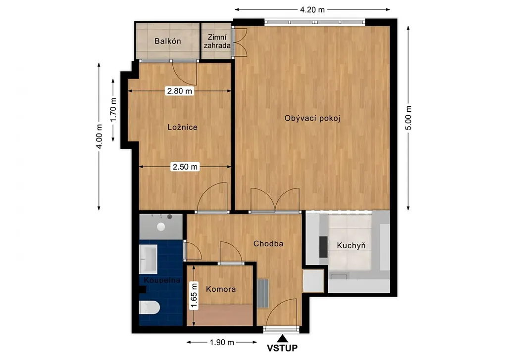 Byt v osobním vlastnictví je v 5. patře cihlového domu s výtahem. Díky velkým oknům a vyššímu patru je krásně světlý a tudíž i útulný. Před několika lety prošel kompletní rekonstrukcí, kdy z původní kuchyně vznikla menší ložnice, zato s vchodem na balkon. Vedlejší obývací pokoj je oproti tomu velmi prostorný a navazuje na něj malý, ale plně vybavený kuchyňský kout. I z obývacího pokoje vede francouzské okno, tentokrát na malou zimní zahradu, která těsně přiléhá k balkonu.