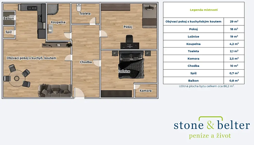 Nabízíme k prodeji atraktivní byt o dispozici 3+kk a celkové ploše 86,2 m², situovaný ve 2. patře udržovaného bytového domu s výtahem. Byt je orientován na východ a západ, což zajišťuje dostatek denního světla po celý den.