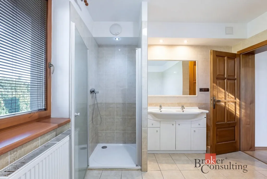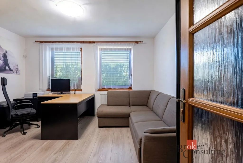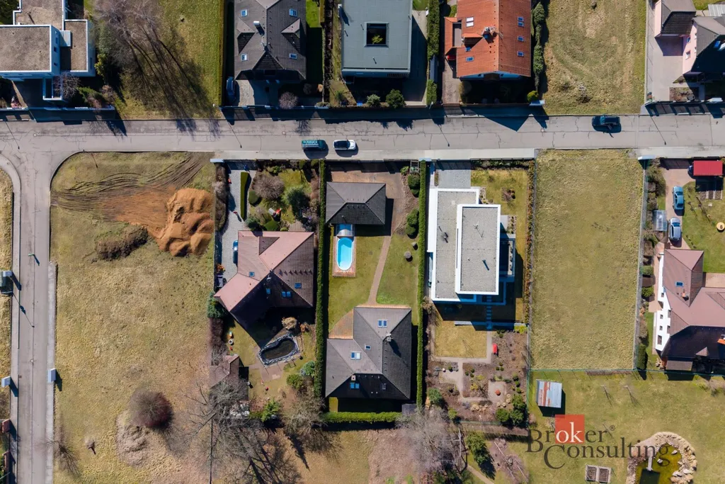 Součástí nemovitosti je také samostatná garáž pro dva vozy s dílnou a koupelnou, přičemž objekt slouží i jako technické zázemí pro bazén. Vysoký standard exteriéru doplňuje vlastní studna, kapénková závlaha podél živého plotu, udržovaná zahrada s okrasnou skalkou a zámková dlažba vedená až k domu. Celek působí reprezentativně, prakticky a zároveň velmi příjemně pro každodenní rodinný život.