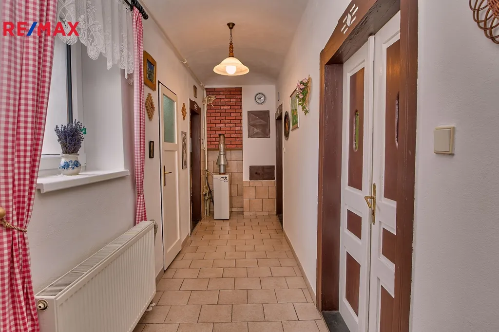 Obytná část domu je připravená k okamžitému bydlení a nabízí ložnici, obývací pokoj, kuchyň s pecí, špajz, koupelnu s vanou a samostatnou toaletu.