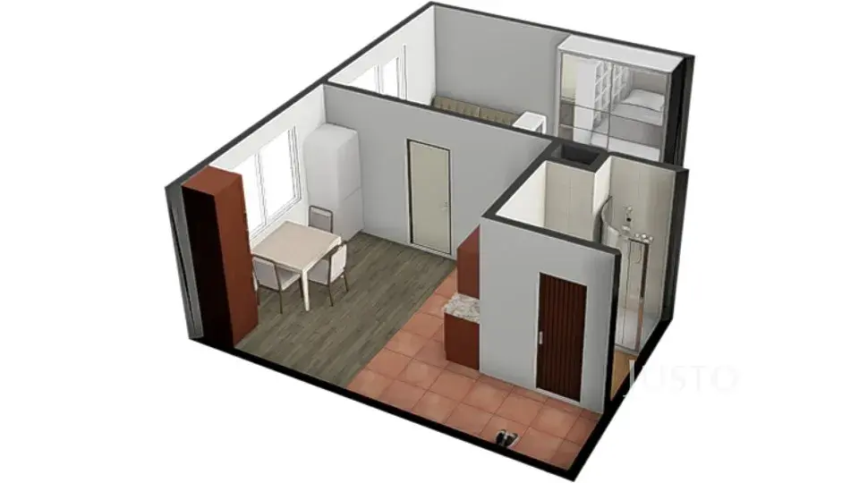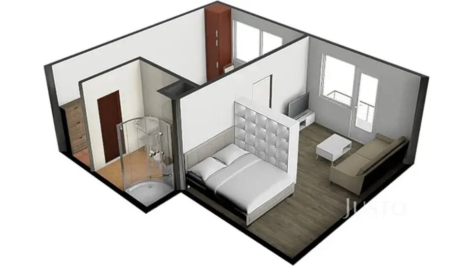 Byt je umístěn v prvním patře panelového domu s výtahem a je částečně vybaven. Ze vstupní chodby vedou dveře vlevo do koupelny s WC a sprchovým koutem. Naproti vstupu je kuchyně vybavená kuchyňskou linkou, která je průchozí do světlého pokoje. Z pokoje je přímý vstup na jižně orientovaný balkon, odkud je příjemný výhled do okolí a dostatek denního světla po celý den. K bytu náleží sklep o ploše 1 m², který poskytuje další úložný prostor.