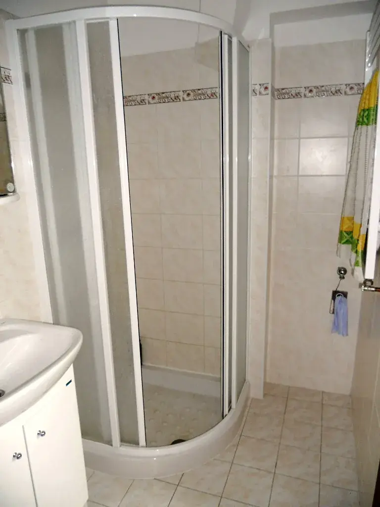 Koupelna : sprchový kout, umyvadlo, přípojka na pračku, dveře na WC.