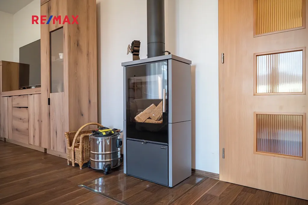 Dům působí velmi příjemně, vzdušně a zároveň útulně. Obývací pokoj nabízí dostatek prostoru pro rodinný život i odpočinek a díky velkým oknům je krásně prosvětlený po celý den. Přímý vstup na terasu a zahradu přirozeně propojuje interiér s venkovním prostorem a vytváří ideální místo pro každodenní relaxaci.