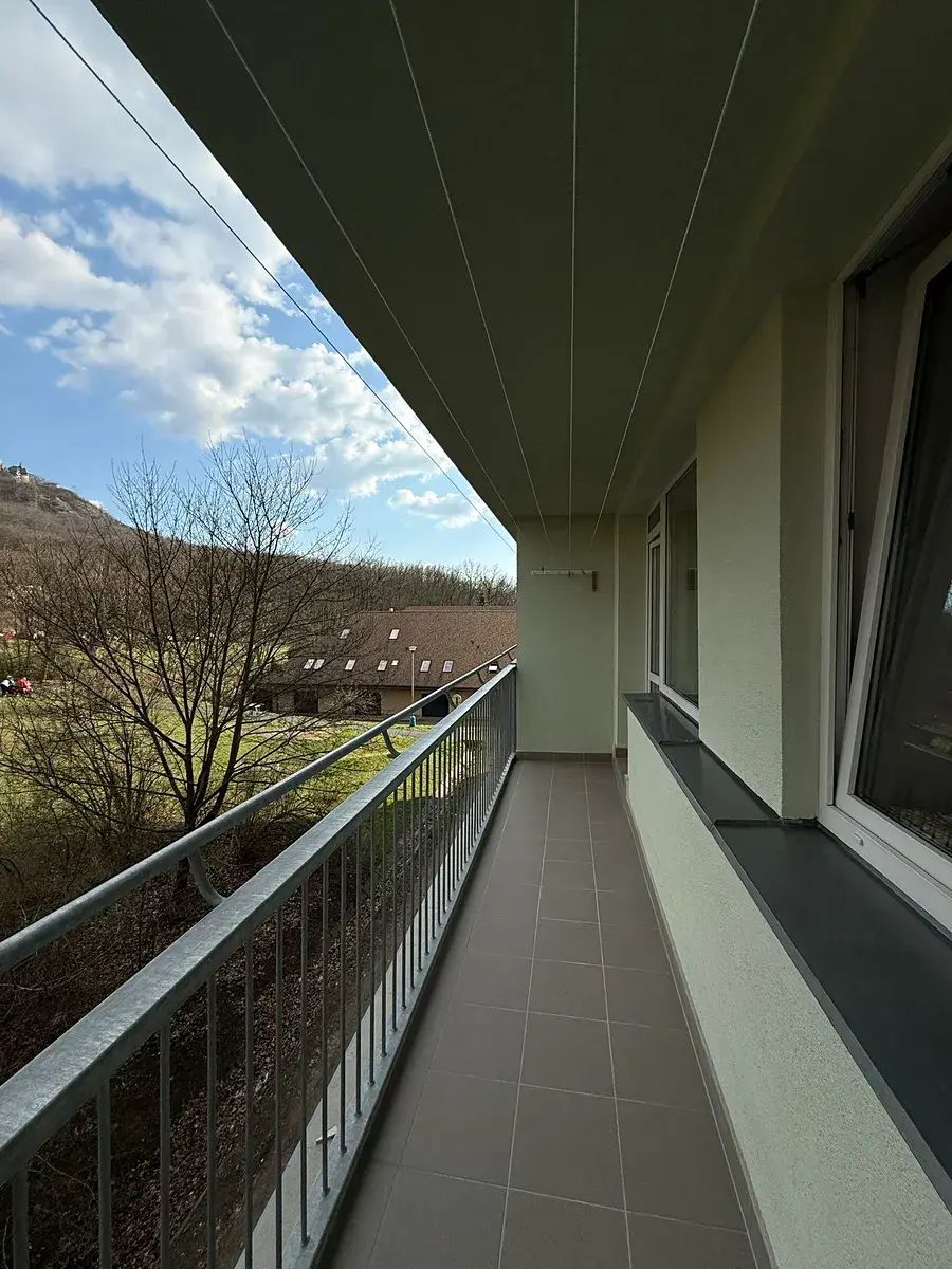 Dispozice doposud neobývaného bytu nabízí novému nájemci vstupní chodbu s prostornou vestavěnou skříní se zrcadly, které chodbu opticky zvětšují a prosvětlují, obývací pokoj s kuchyňským koutem se vstupem na lodžii orientovanou do zeleně a s výhledem na hrad Doubrava, samostatnou ložnici a koupelnu se sprchovým koutem, umyvadlem, toaletou a připravenou přípojkou na pračku.
