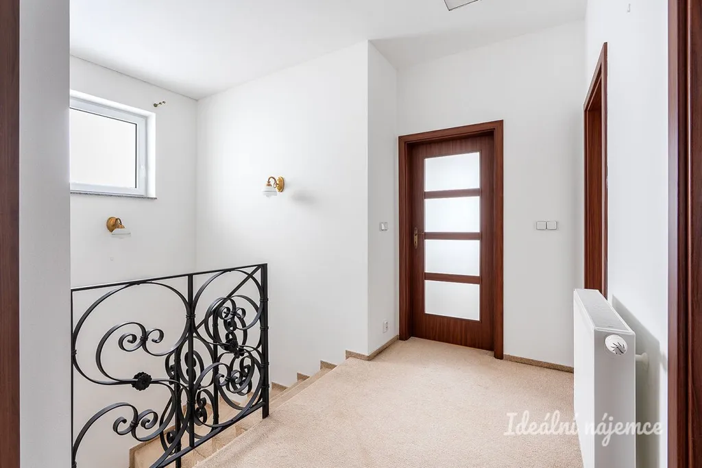 Interiér domu je nabízen jako částečně vybavený, což budoucím nájemníkům poskytuje skvělou příležitost doladit si domov podle vlastního vkusu a potřeb. Srdcem domu je samostatná kuchyně s jídelním koutem, která je plně vybavena všemi moderními spotřebiči včetně lednice s mrazákem, elektrické trouby, varné desky, myčky a digestoře. Světlý obývací pokoj disponuje pohodlnou sedací soupravou, konferenčním stolkem a praktickým úložným prostorem. Dispozici dále doplňují tři samostatné pokoje, které lze variabilně využít jako ložnici, dětské pokoje nebo pracovnu. Komfortní koupelna je vybavena vanou i sprchovým koutem, přičemž toaleta je pro větší soukromí umístěna samostatně.