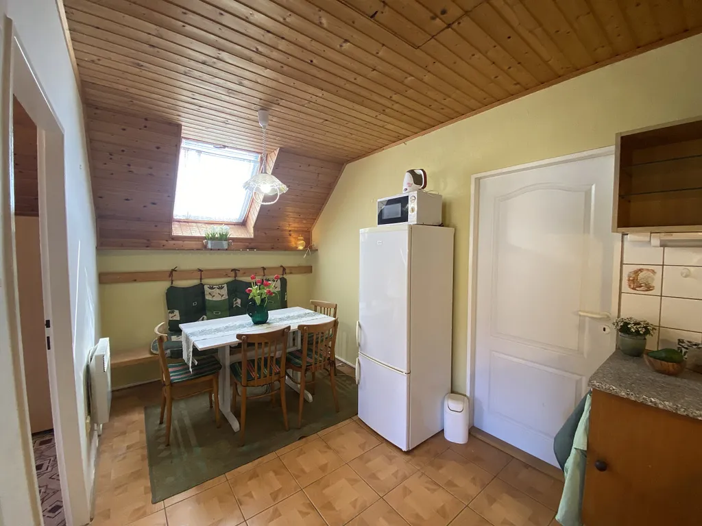 Ve druhém, podkrovním patře se nachází kuchyně a dvě samostatné ložnice. Vytápění vlastními klimatizačními jednotkami nebo přímotopy. Ohřev vody bojlerem. k dispozici mikrovlnka, varná konvice, velká lednice s mrazákem, dvouplotýnkový vařič.