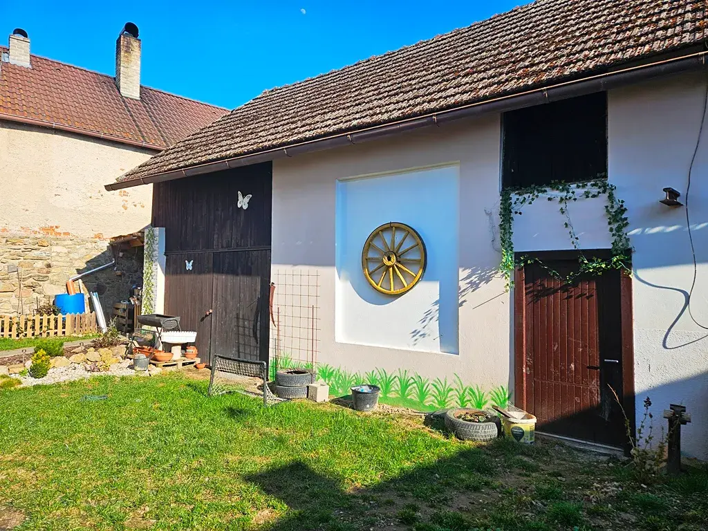 K domu náleží uzavřený dvůr, pergola, stodola a dílna.