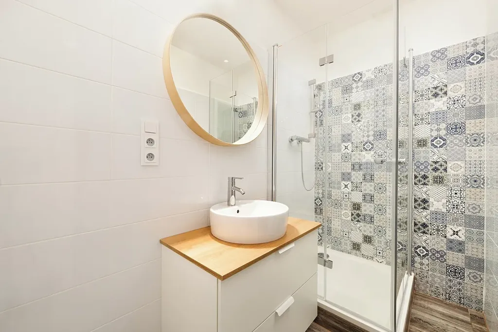 Koupelna je vybavena sprchovým koutem, má umyvadlo s úložnou skříňkou, moderní zrcadlo a dostatek prostoru pro pračku (sušičku).