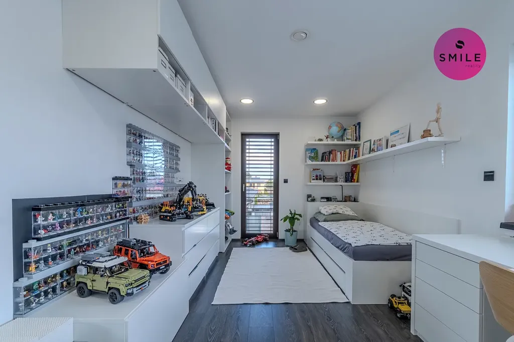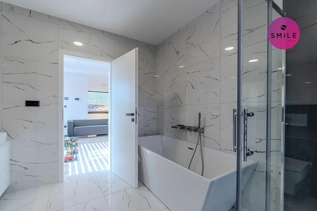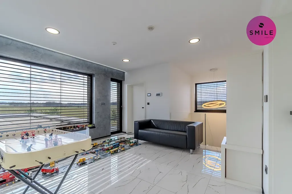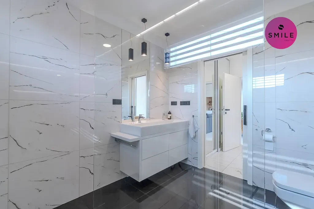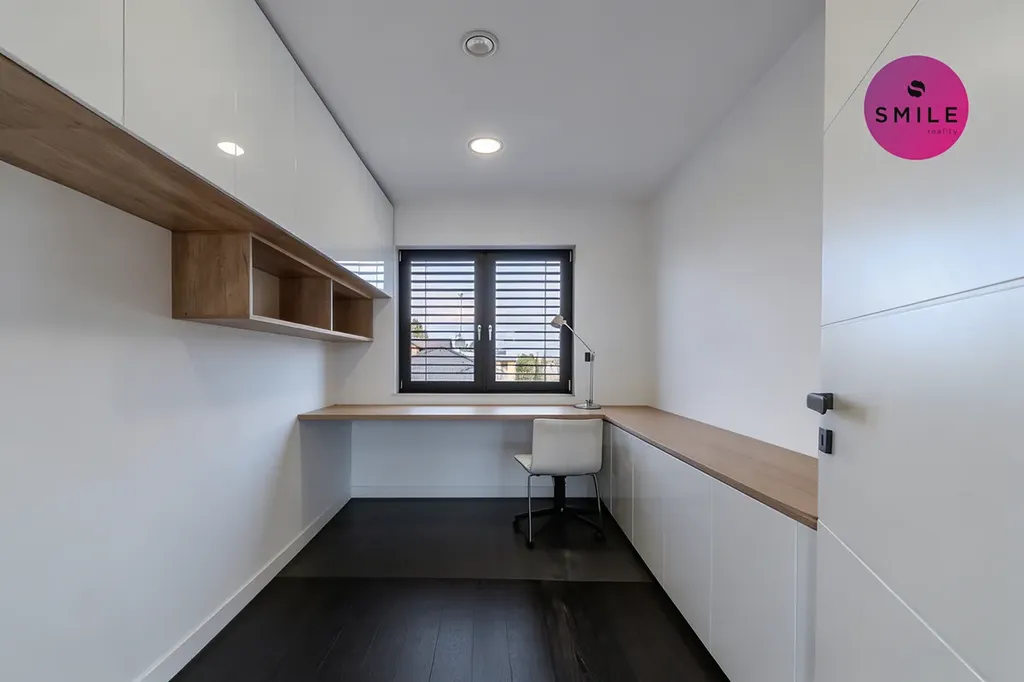 V interiéru nechybí prvky, které podtrhují celkový nadstandard domu – centrální vysavač Electrolux, okna s trojskly, sítě proti hmyzu, venkovní žaluzie či designové vypínače. Dům nabízí také praktické technické zázemí, dostatek úložných prostor a celkově velmi komfortní provoz pro každodenní rodinné fungování.