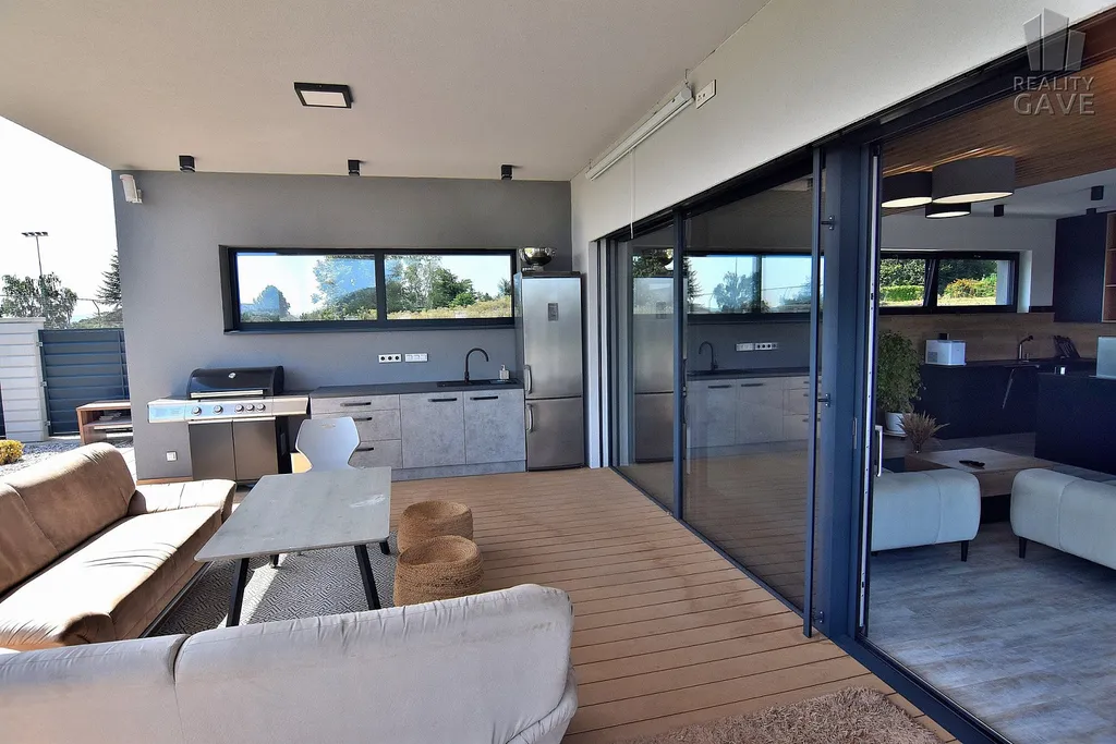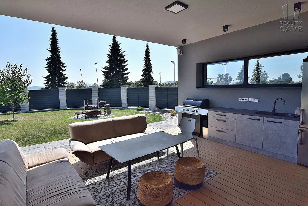 Zastřešená terasa plynule navazuje na interiér a vytváří plnohodnotnou venkovní obytnou zónu s plně vybavenou letní kuchyní. Je to Ideální místo pro dlouhé letní večery, společenská setkání i klidné chvíle jen pro vás.