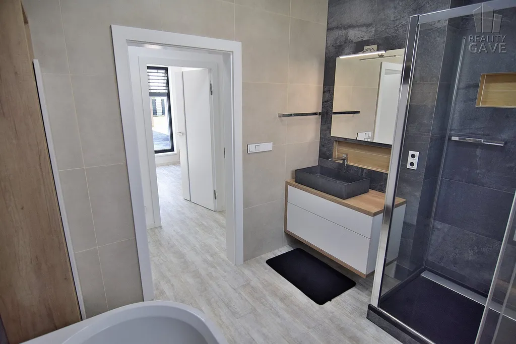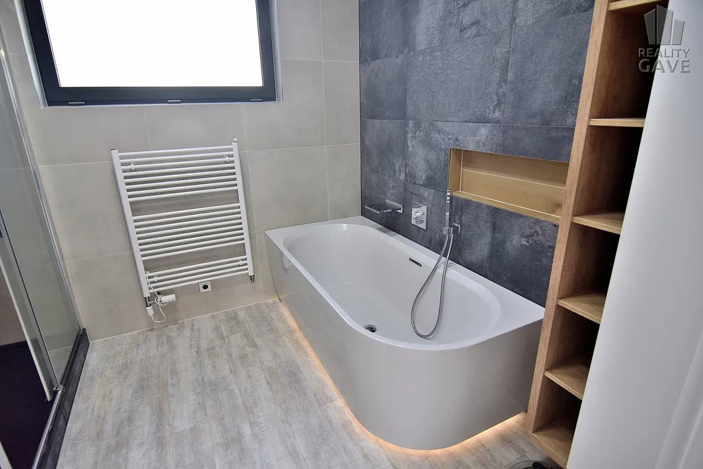 Designová koupelna s vanou i sprchovým koutem je dostatečně velká a jak vystřižená z časopisu.