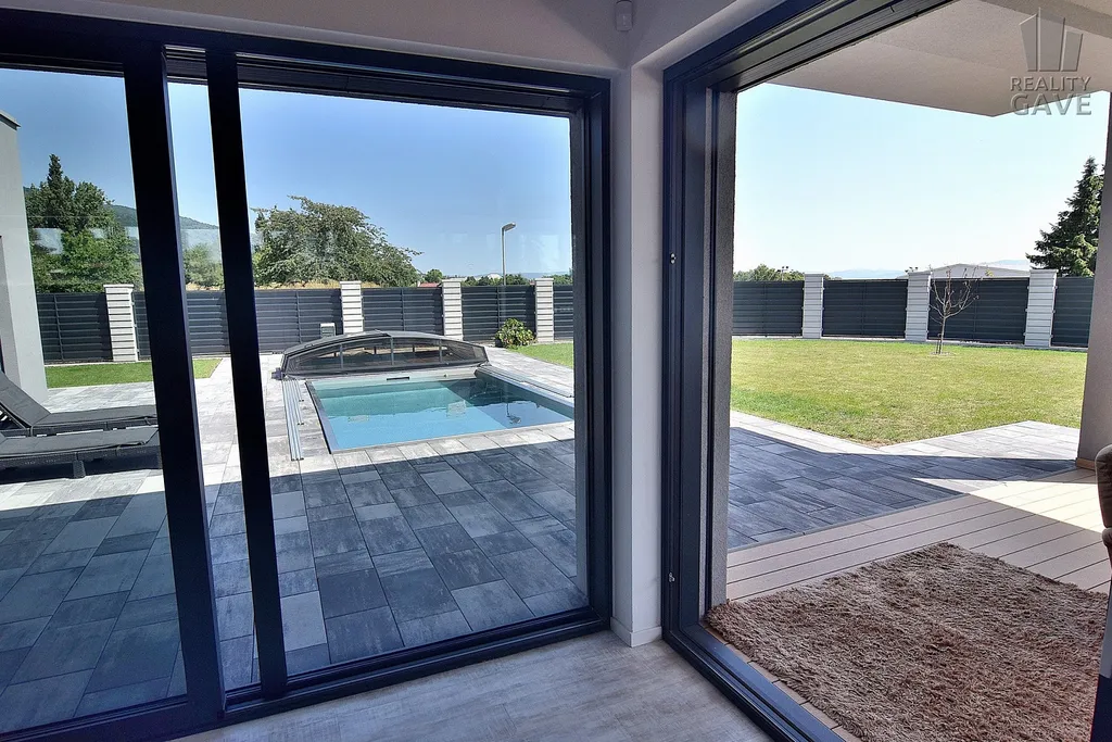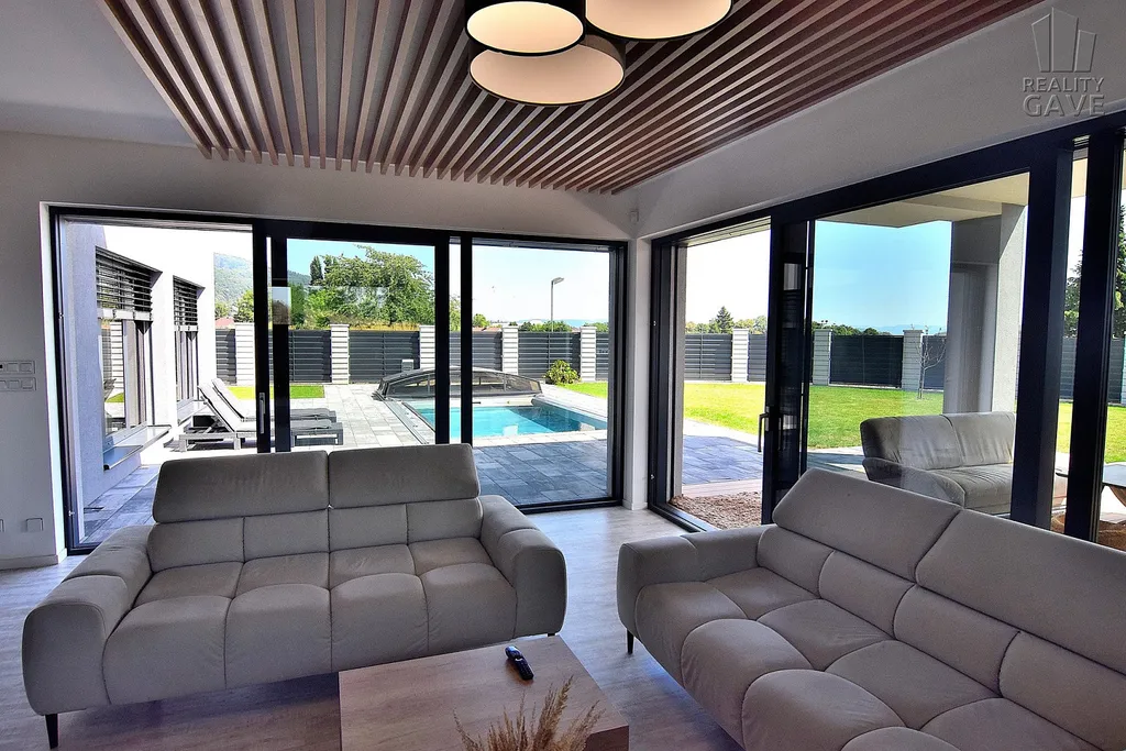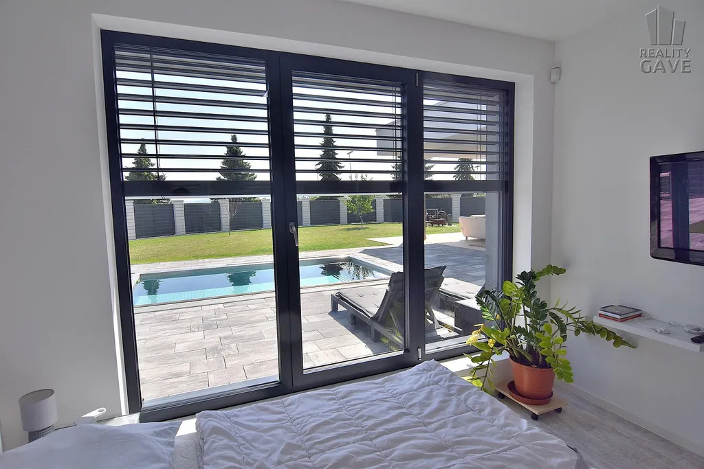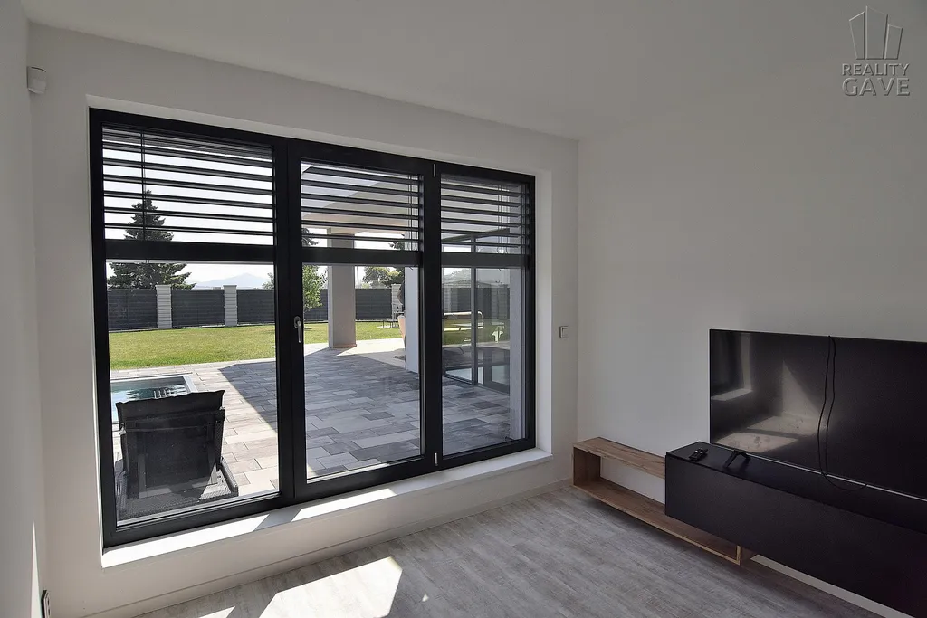 Hlavní obytný prostor je definicí moderního luxusu – otevřený, vzdušný a zaplavený denním světlem díky velkoformátovým proskleným stěnám a okny s venkovními žaluziemi. Každý pohled směřuje ven – na terasu, bazén a upravenou zahradu. Díky ostrůvku nevaříte do zdi, ale s výhledem.