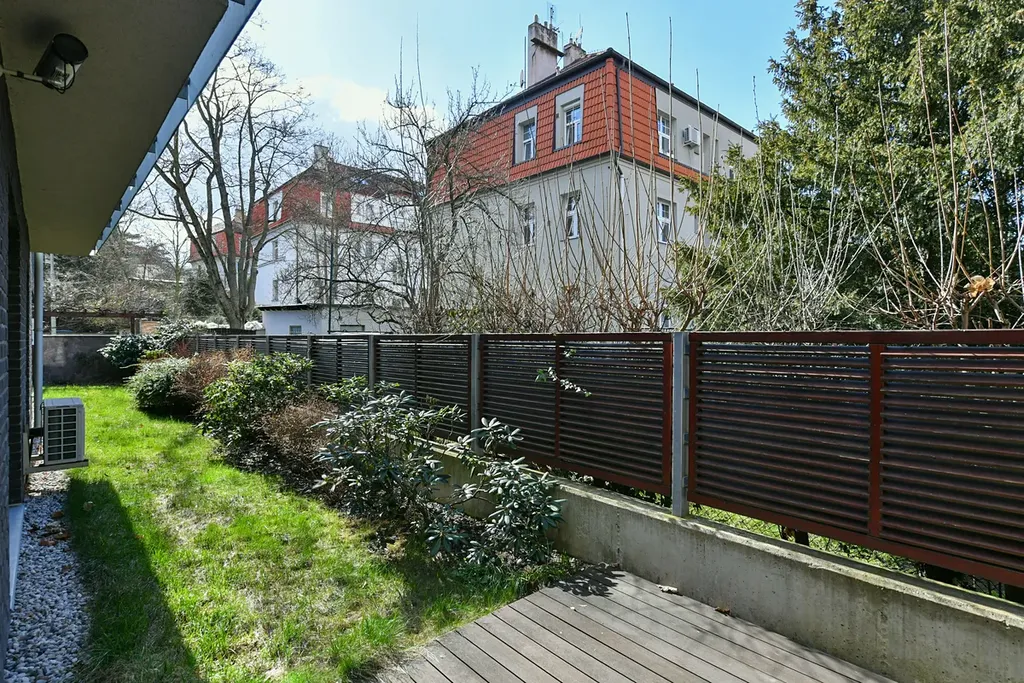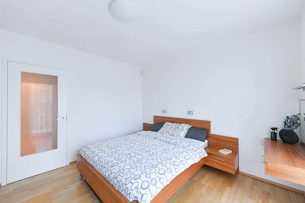 Hlavní ložnice nabízí maximální komfort díky manželské posteli, vestavěným skříním a vlastní klimatizaci. Druhý pokoj je aktuálně využíván jako pracovna a poskytuje flexibilní využití dle potřeb nájemce. Z obou pokojů je zajištěn přímý vstup na zahradu, což umocňuje pocit propojení interiéru s exteriérem.