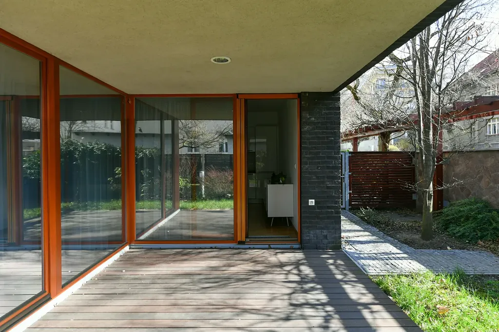 Z obývacího pokoje je přímý vstup na terasu o velikosti 7,6 m², která plynule navazuje na soukromou zahradu o rozloze 135 m² – ideální místo pro relaxaci, posezení s přáteli či rodinné chvíle v zeleni.