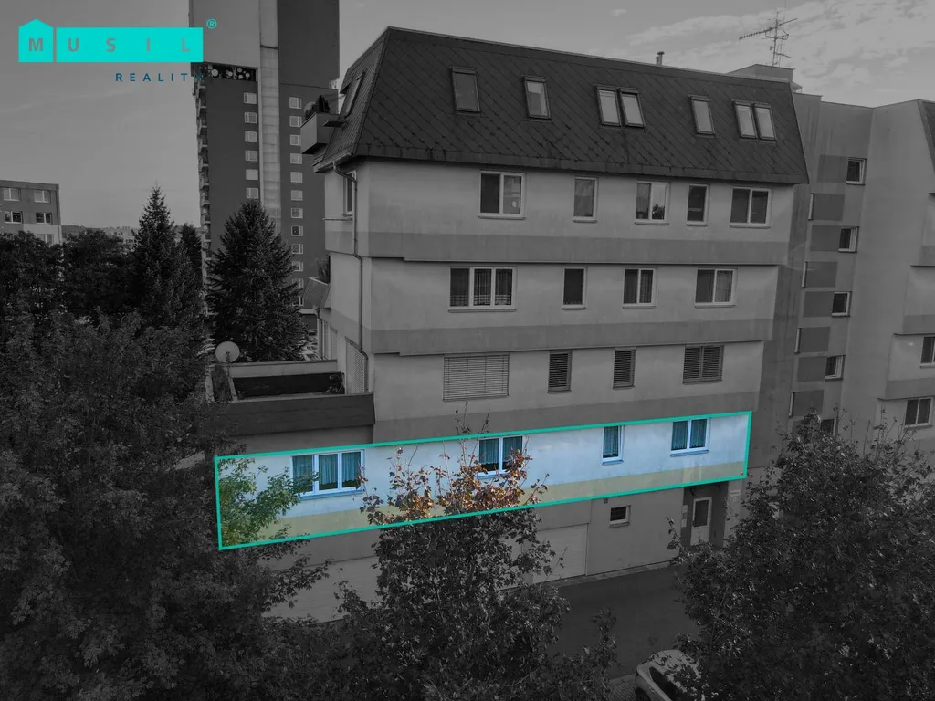 Byt je složen z většího obývacího pokoje s plně vybavenou kuchyňskou linkou v pastelových barvách. Obývací část bytu obohacuje možnost využití útulné terasy, na kterou se vchází francouzským oknem, o výměře 23m2. Propojení interiéru s exteriérem z tohoto prostoru v letních měsících činí nadstandardní centrální bod rodinného bydlení.