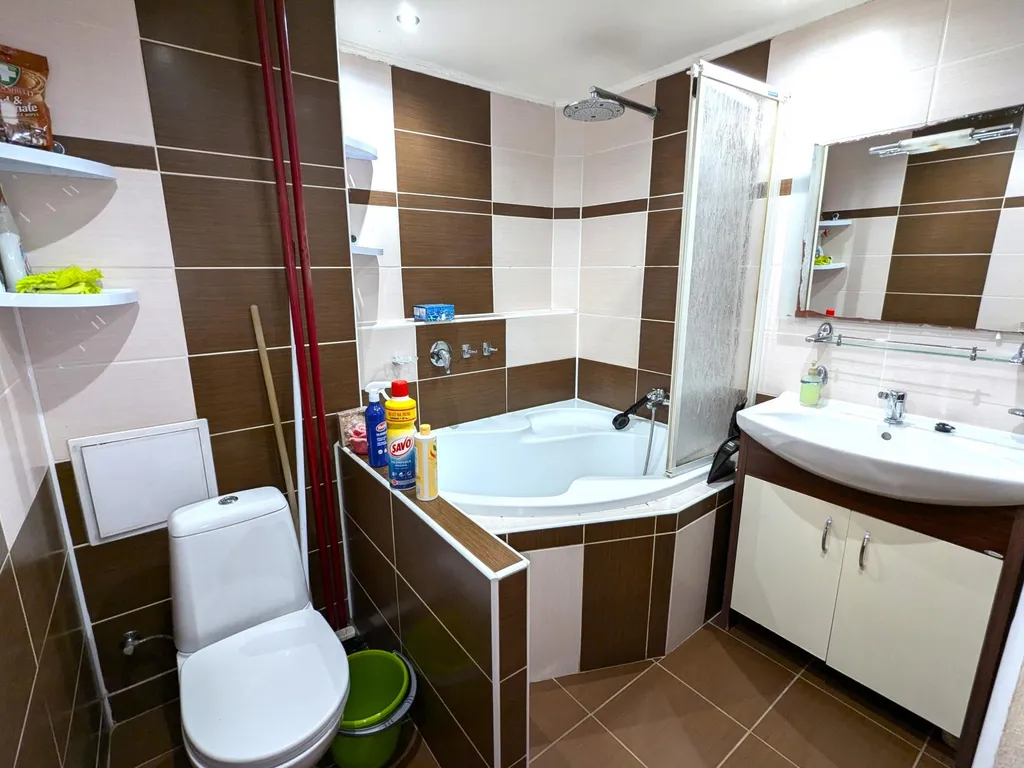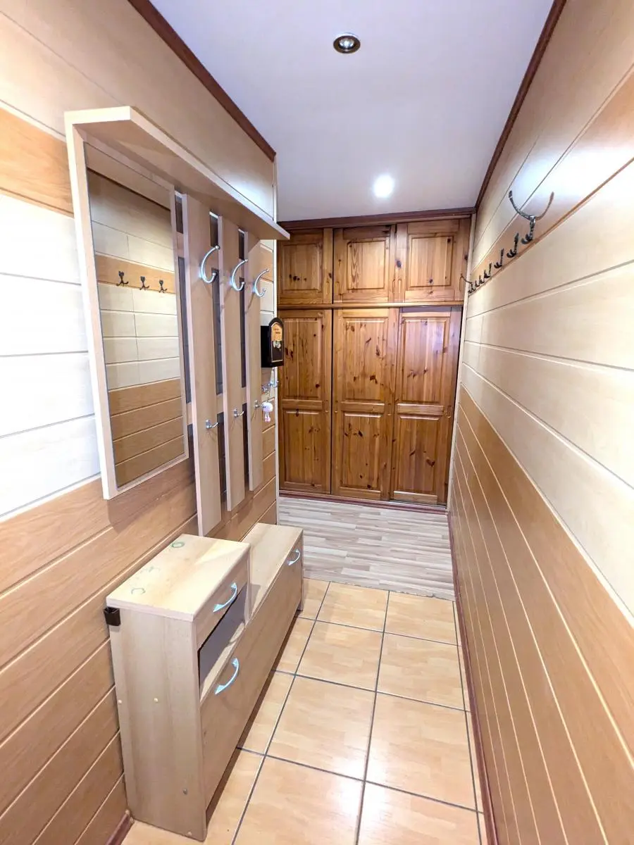 V kuchyni je vkusná rohová kuchyňská linka se všemi spotřebiči. V koupelně je prostorná vana se sprchovou zástěnou, umyvadlová skříňka se zrcadlem a WC. Místnosti jsou prostorné. Interiér je laděn do příjemných barev, nábytek je ve dřevě. Na chodbě se nachází skříň, která nabízí dostatek úložných prostor.