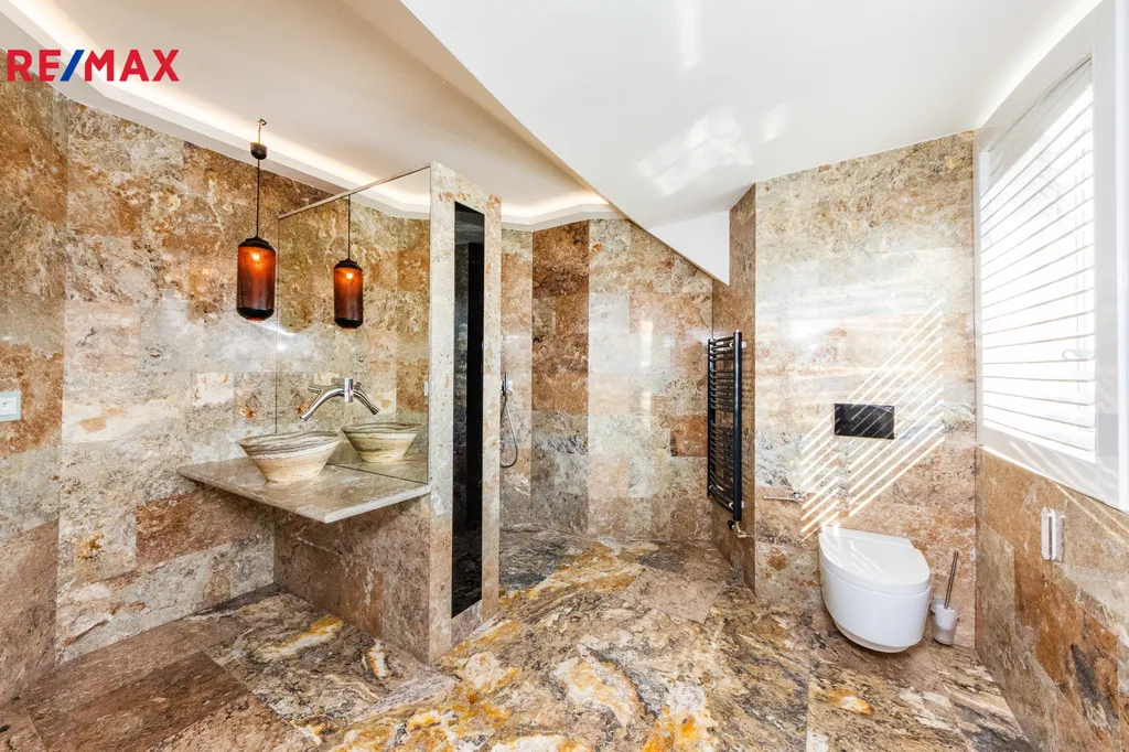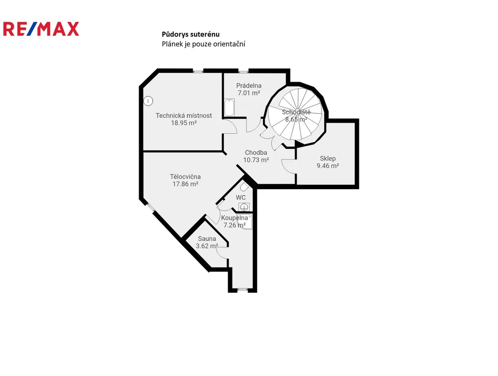 Suterén domu slouží jako relaxační a technické zázemí. Sauna, posilovna a koupelnou se samostatným WC, dále prádelna, kotelna a sklep vhodně doplňují vybavení domu.