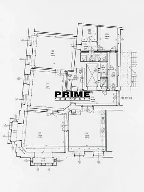 Dispozice prostoru: vstupní předsíň, rohová místnost se 2 arkýři, samostatná, plně vybavená kuchyň (na rozdíl od fotografií je v bytě nová bílá kuchyň s ostrůvkem) se spotřebiči (sklokeramická varná deska, trouba, myčka a lednice s mrazákem), tři další místnosti (dvě jsou velké a jedna je malá a průchozí), dvě koupelny (jedna s vanou, umyvadlem, toaletou a bidetem a druhá se sprchovým koutem, umyvadlem, toaletou a bidetem), šatna / komora, technická komora a samostatné WC.
