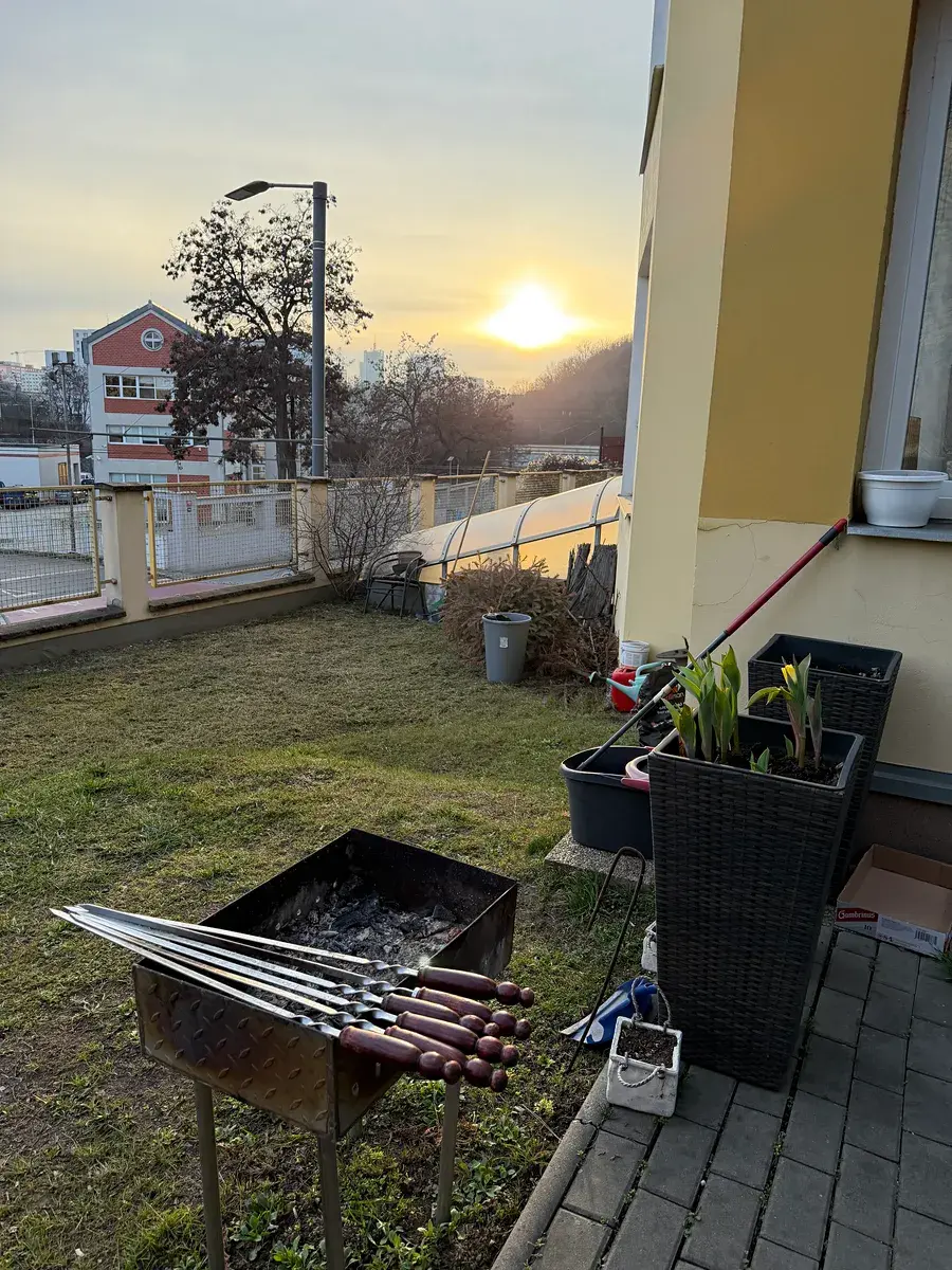 Na terasu navazuje zahrada se vzrostlým stromem, který poskytuje přirozený stín a příjemnou atmosféru v letních měsících. Již nyní jsou zde vysazeny okrasné rostliny, které dotvářejí útulný charakter prostoru. Zahrada vybízí k dalšímu zútulnění – ať už doplněním zahradního nábytku, bylinkové zahrádky nebo vytvořením relaxační zóny. Díky velikosti prostoru zde může vzniknout například venkovní sauna, rozšířená zimní zahrada nebo přístřešek navazující na byt, který umožní celoroční využití venkovní části.