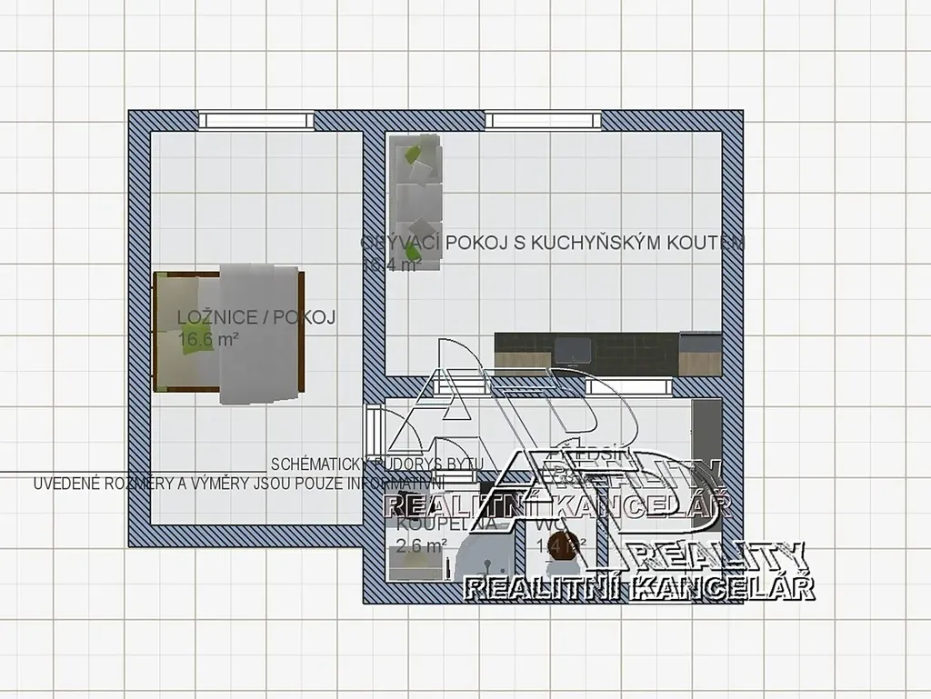 Dispozice bytu: obytná místnost s kuchyňským koutem [16,5m2], předsíň [7,7m2], pokoj / ložnice [16,5m2], koupelna [2,5m2] a WC [1,1m2].