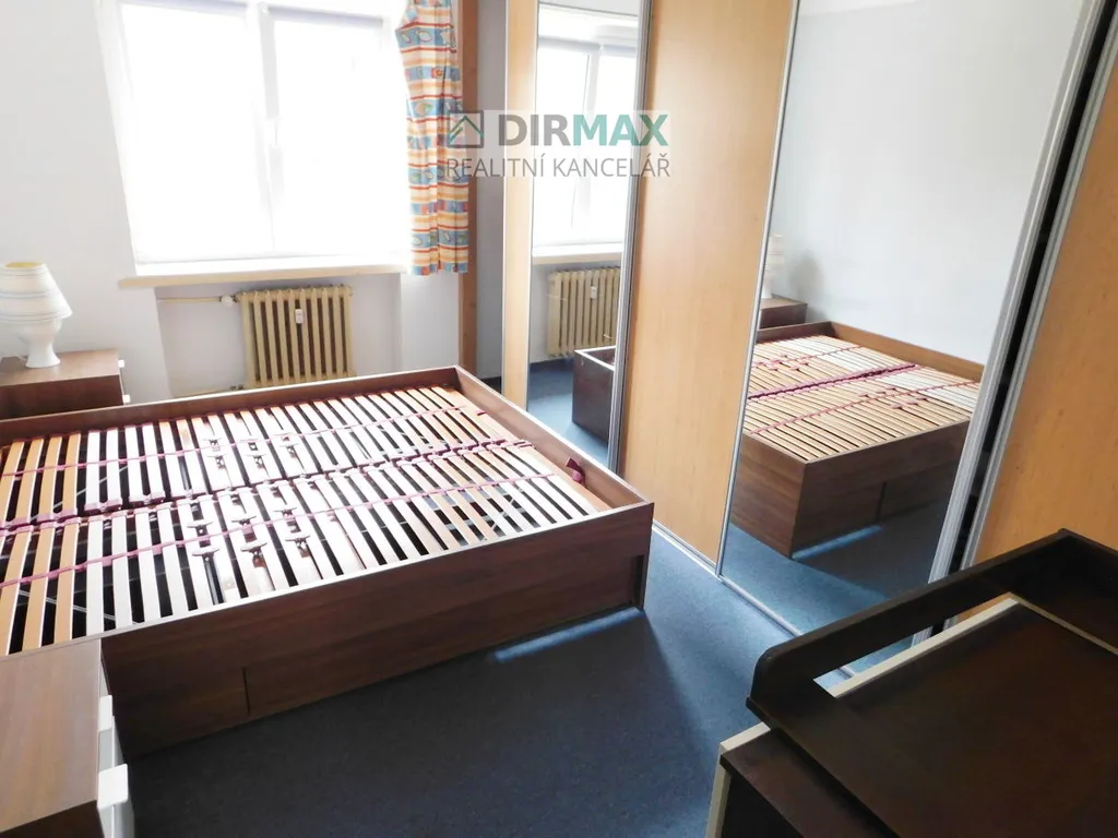 Ve druhé místnosti je postel (rošt) bez matrací a vestavěná skříně.