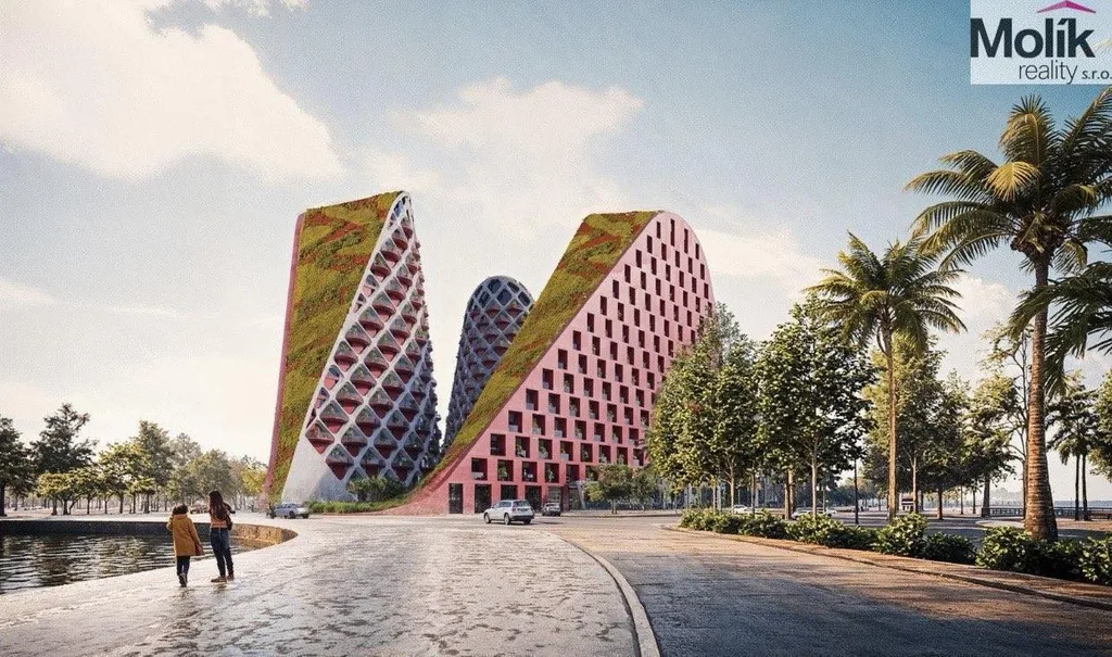 Výšková dominanta: Moderní 16patrová budova s unikátní fasádou pokrytou bujnou vegetací.