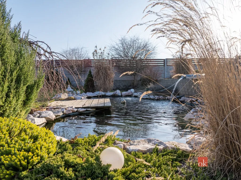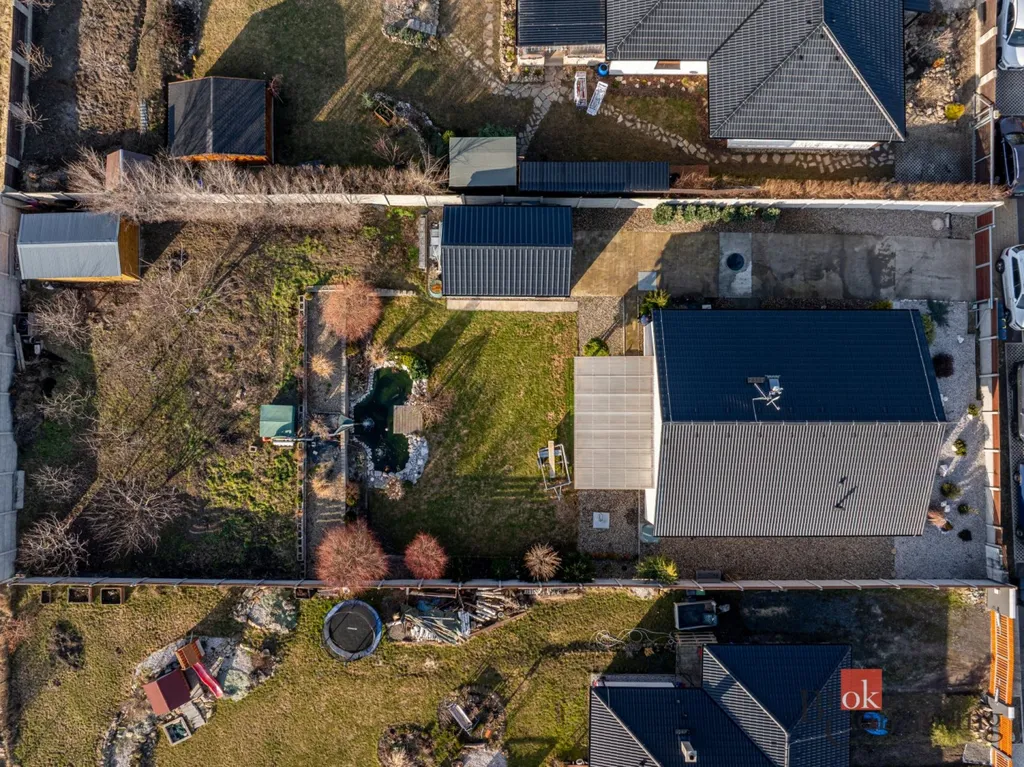 Velkým benefitem této nemovitosti je pečlivě upravená zahrada, která nabízí naprosté soukromí a prostor pro relaxaci. Nachází se zde okrasné jezírko, vzrostlé stromy, květiny, trávník, menší sad i dekorativní prvky z kamene, které společně vytváří harmonické a velmi příjemné prostředí. Součástí zahrady je také pergola ideální pro posezení s rodinou či přáteli a praktický zahradní domek, který lze využít jako garáž nebo kůlnu.