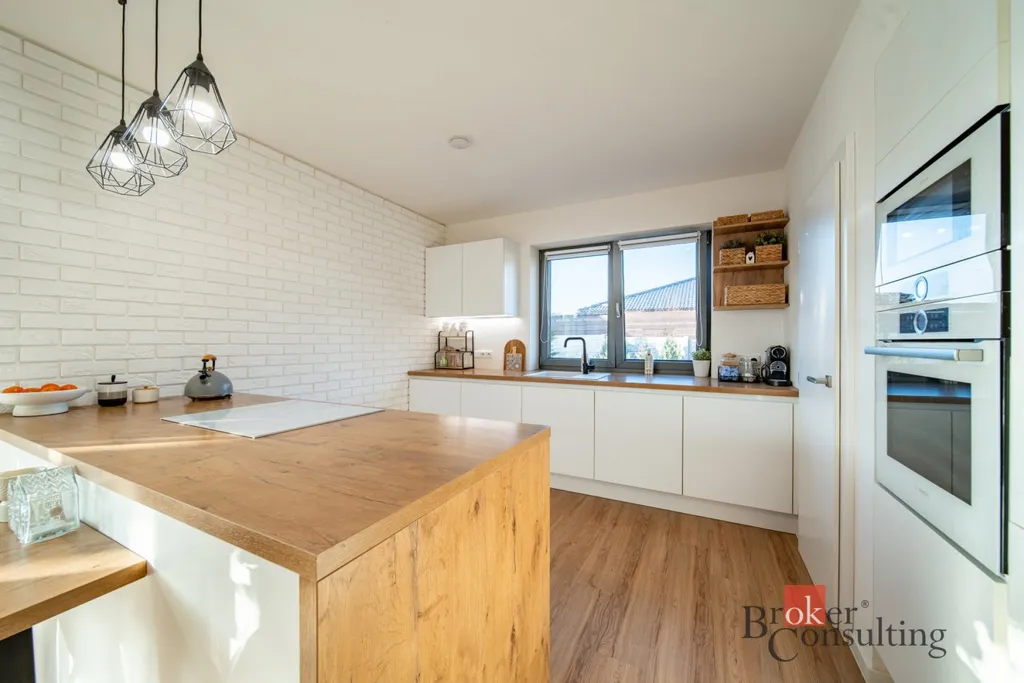 Interiér působí moderním a vzdušným dojmem a zůstává částečně vybavený, což novým majitelům usnadní nastěhování.