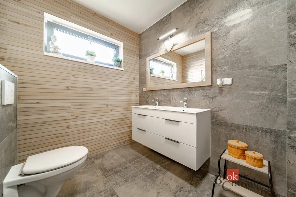 Dále zde najdete ložnici a dva samostatné dětské pokoje, plně vybavenou koupelnu a technickou místnost s druhým WC.