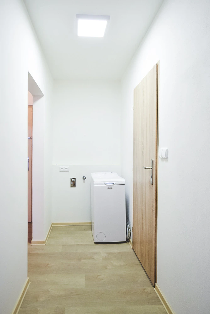 Byt se nabízí částečně vybavený. Prosvětlená kuchyňská linka disponuje lednicí s mrazákem, elektrickou troubou, sklo-keramickou indukční deskou, digestoří a myčkou. Ostatní pokoje jsou nevybavené a jsou neprůchozí. Nová koupelna je vybavena sprchovým koutem, umyvadlem se zrcadlem a toaletou. V bytě je k dispozici pračka a šatna jako místnost navíc.