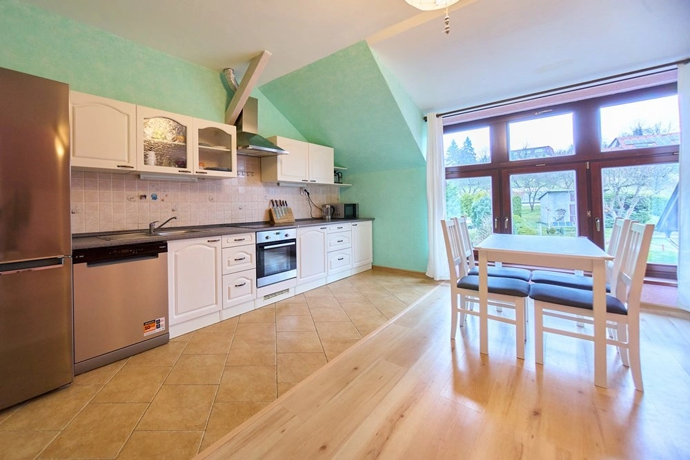 Dominantou bytu je prostorný obývací pokoj s kuchyňským koutem. Interiér je vybaven prostornou kuchyňskou linkou se spotřebiči.