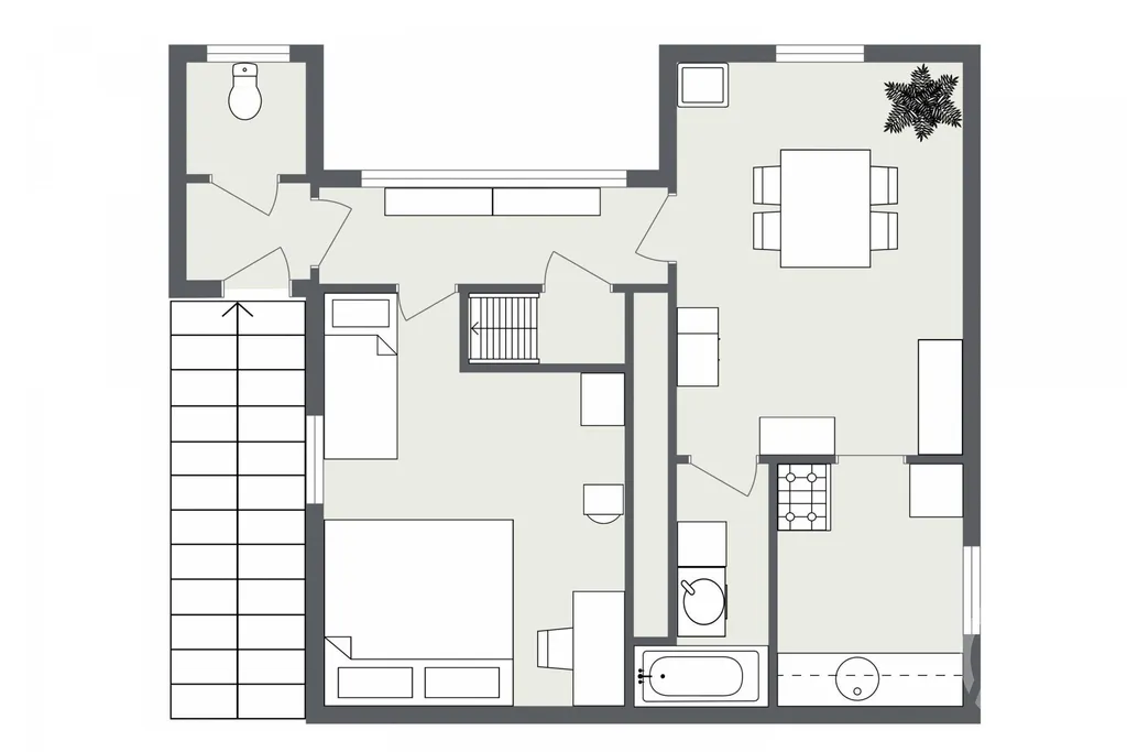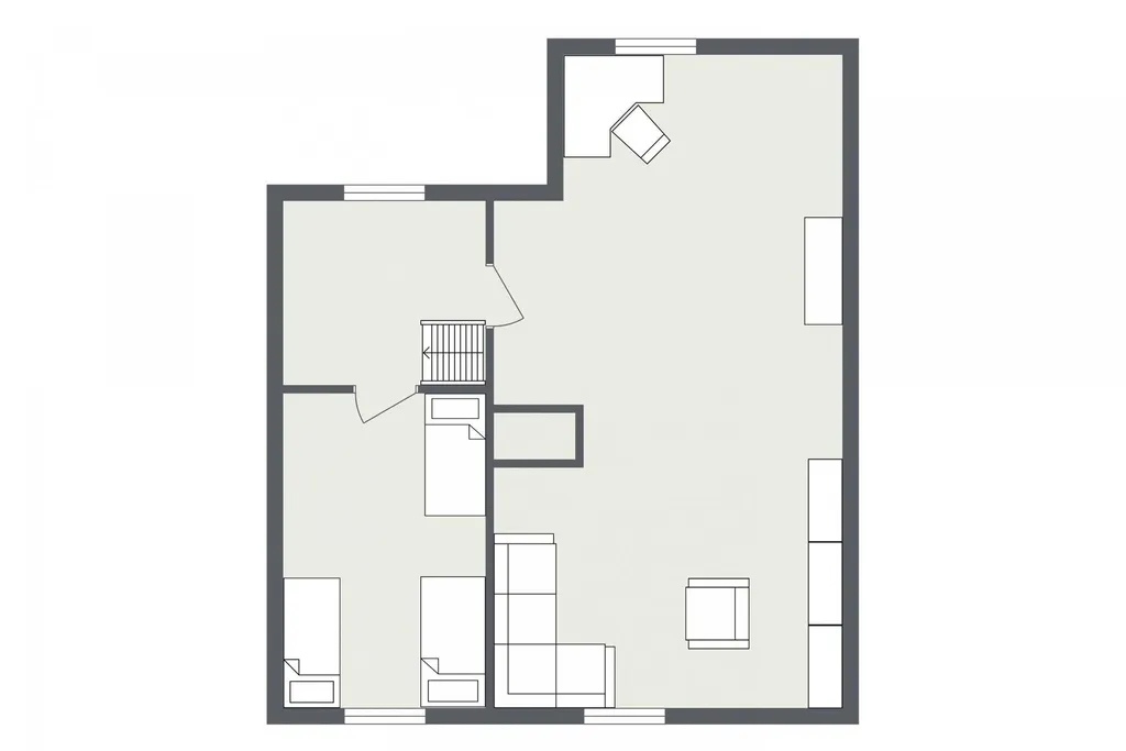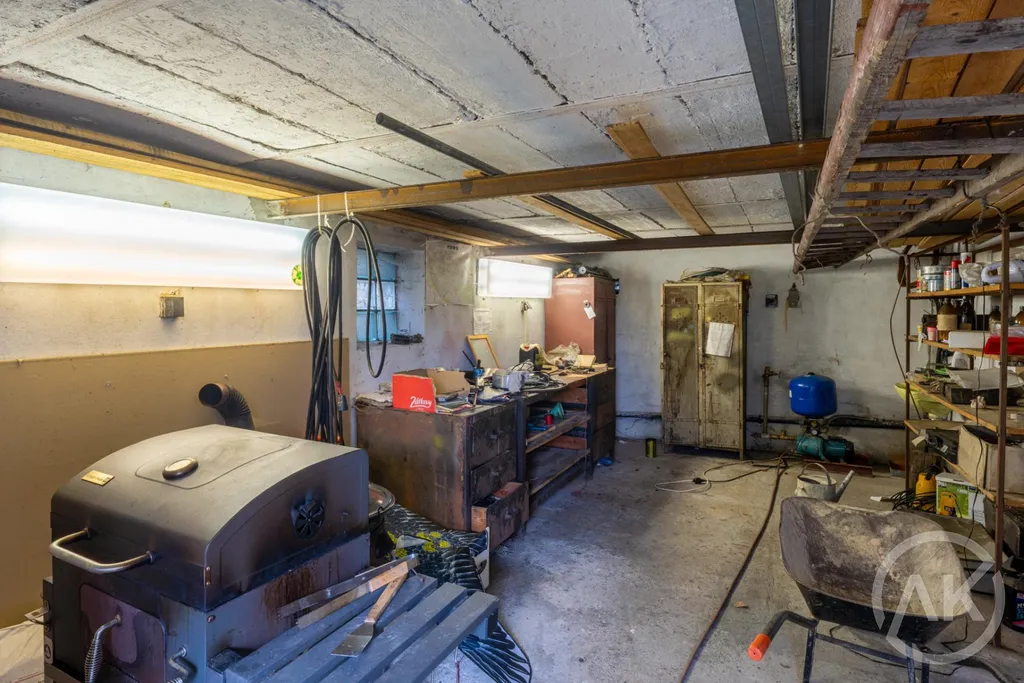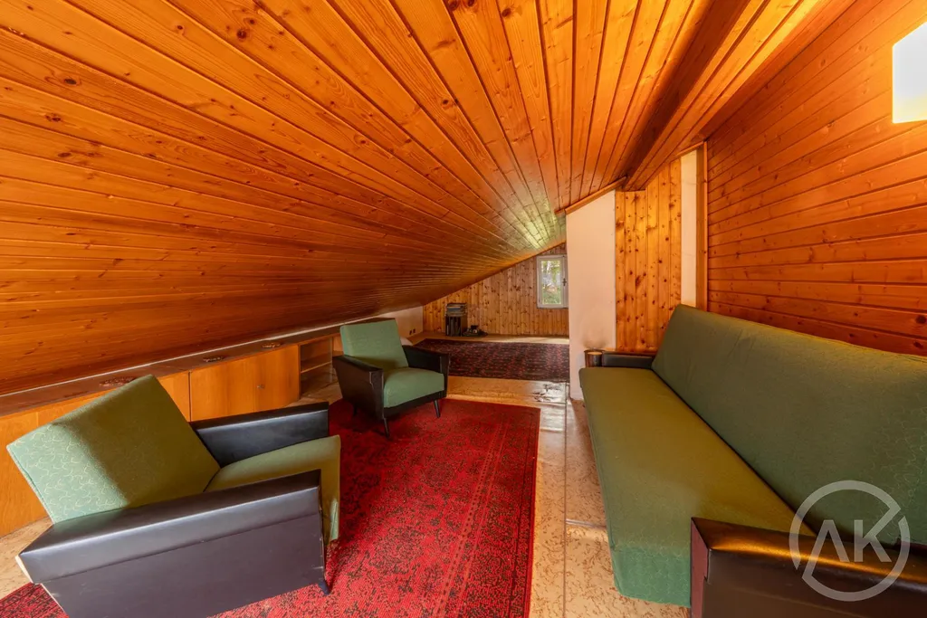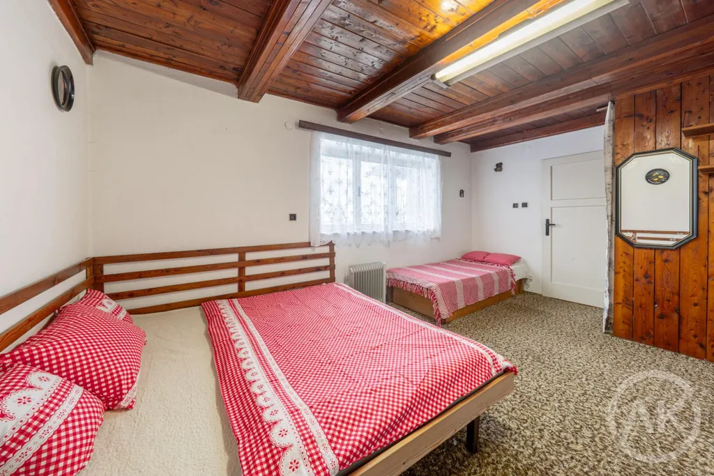 Současná dispozice 3+1 s koupelnou a WC, k tomu garáž a sklep. K chatě je vydané stavební povolení na rekonstrukci, takže pokud nechceš jen víkendovou chatu, ale něco víc, můžeš se do toho pustit hned. Při rekonstrukci se tu dá udělat velký obývák s kuchyní a krbem nebo kamny, terasa, čtyři ložnice, dvě koupelny a klidně sauna se zázemím a párty místnost.