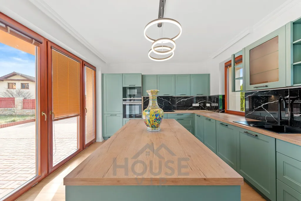 Součástí domu je zcela nová luxusní kuchyň na míru, vybavená spotřebiči značky Siemens, která potěší i náročné uživatele. Velká lednice, velký mrazák se sedmi přihrádkami, lednice na nápoje a spousta úložného prostoru.