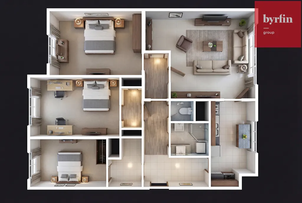 Dispozičně jde o velmi dobře řešený byt s orientací na dvě světové strany, který nabízí dostatek prostoru pro rodinné bydlení. Právě dispozice je jeho největší devizou – dává smysl, funguje a umožňuje vytvořit opravdu komfortní domov přesně podle vlastních představ.
