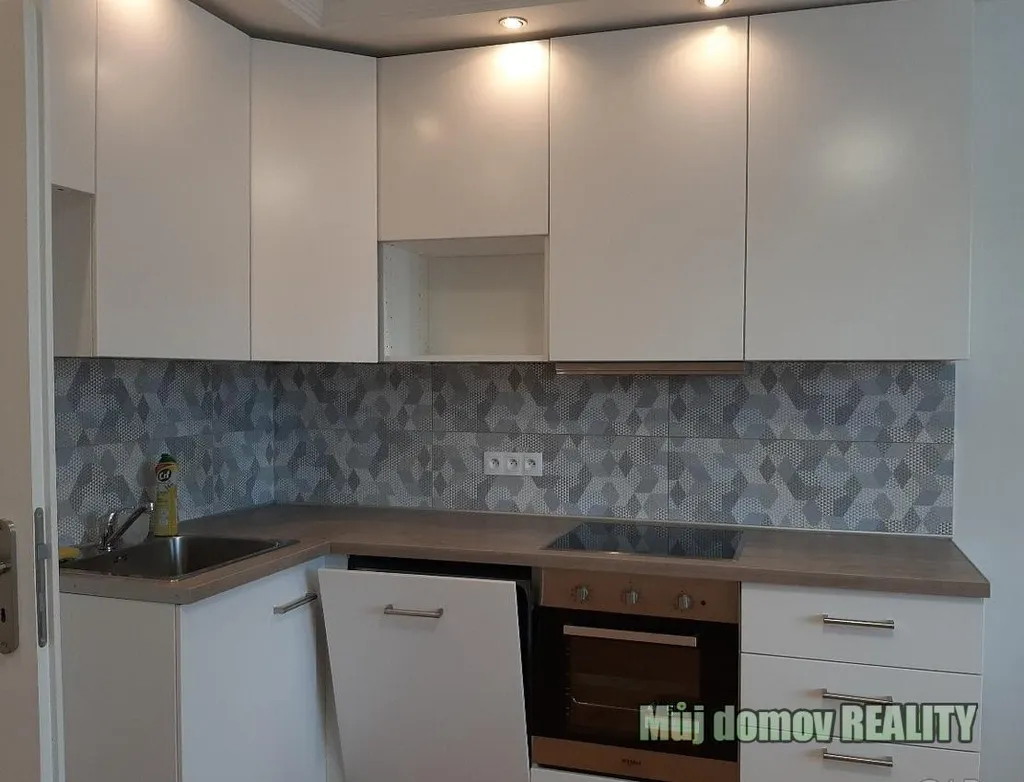 Byt je kompletně zrekonstruovaný s novou kuchyňskou linkou a moderními materiály.
