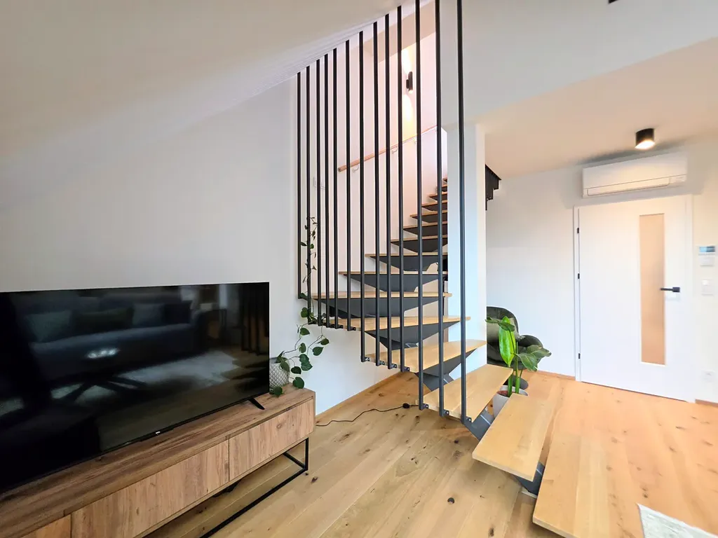 Interiér bytu byl navržen s důrazem na nadčasovou eleganci, kvalitní materiály a maximální komfort. Obytný prostor přirozeně navazuje na terasu, která poskytuje ideální místo pro relaxaci i společenská setkání s výjimečnou atmosférou města pod vámi.