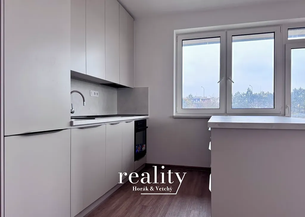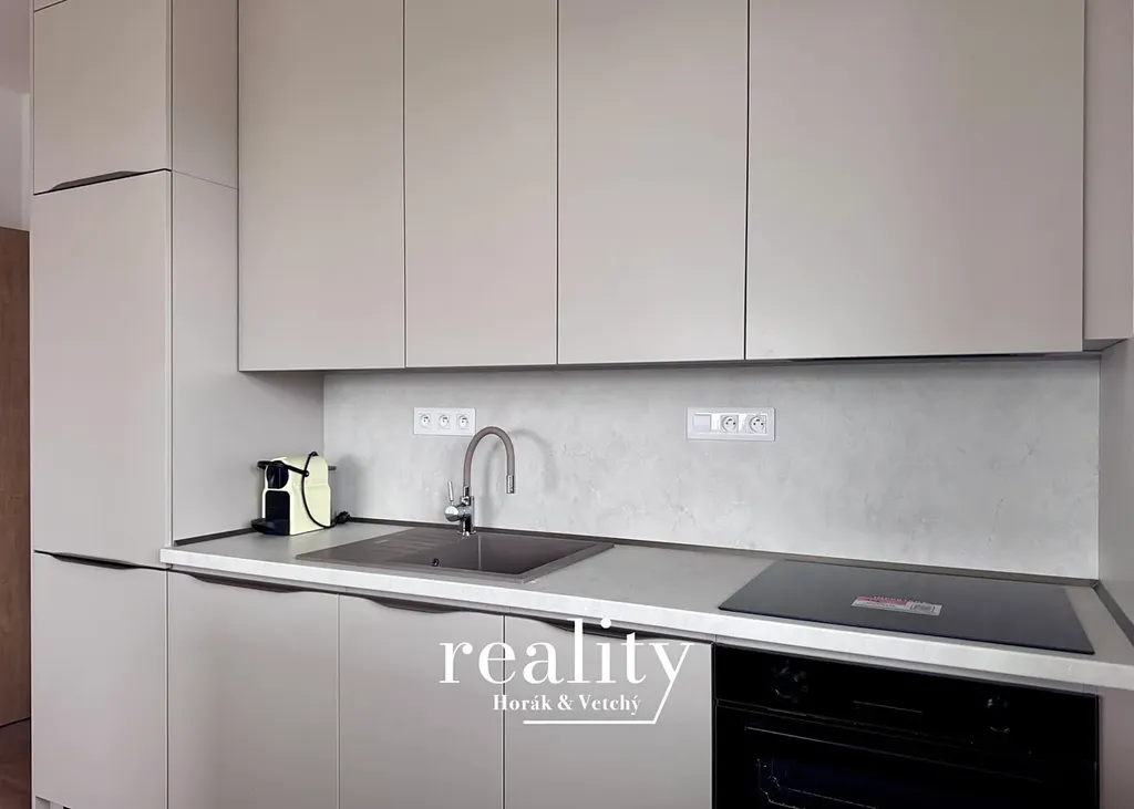 Byt je vybaven moderní kuchyňskou linkou s vestavěnými spotřebiči – lednicí s mrazákem, myčkou a dominantním kuchyňským ostrůvkem, který nabízí velké množství úložného prostoru a zároveň přirozeně propojuje kuchyň s obytnou částí.